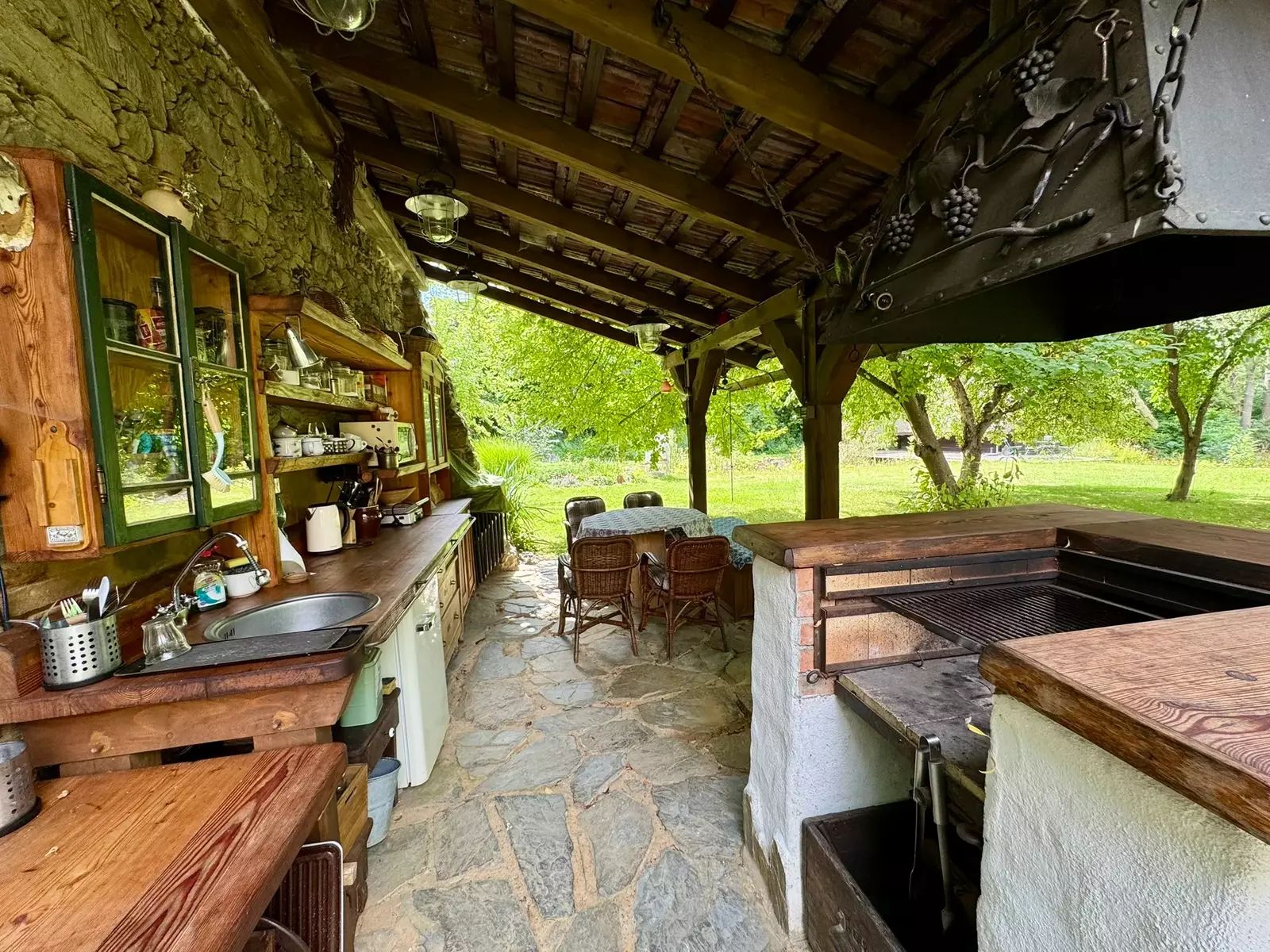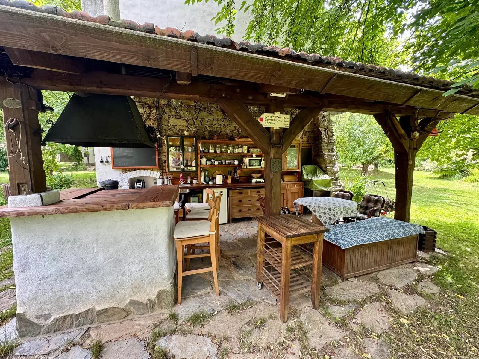 Samostatně stojící stodola je využívána z části jako společenská místnost či vinárna se vstupem na obytnou půdu. Součástí je i zahradní kuchyň s pergolou a venkovním posezením. Druhá část přízemí je využita jako sklad zahradního nářadí.