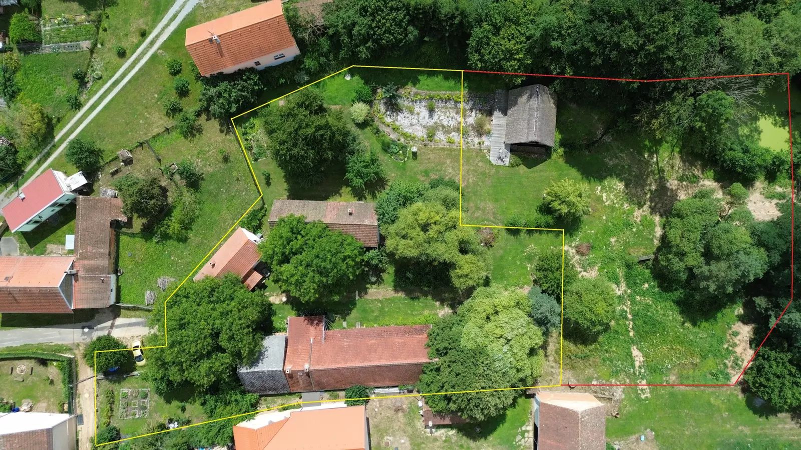 Soubor nemovitostí se skládá ze dvou chalup s číslem popisným, stodoly a samostatně stojící srub. Součástí prodeje je soubor pozemků vyznačený na leteckém pohledu zeleně. Červeně vyznačený pozemek je v pronájmu od Státního pozemkového úřadu.
