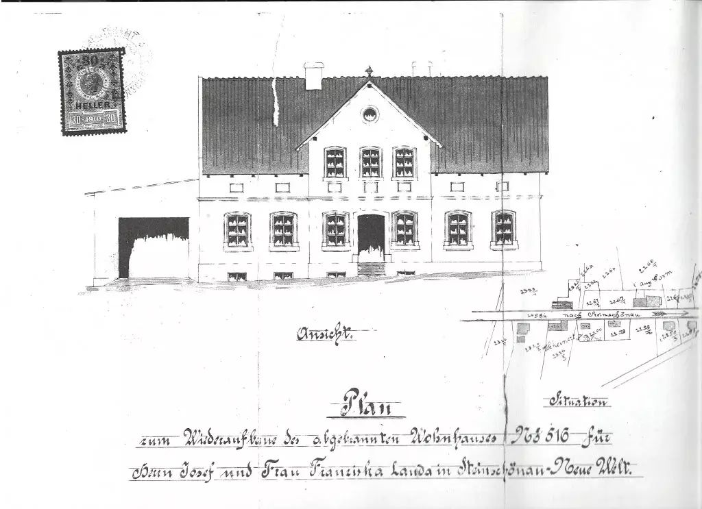 První zmínka o dokončené stavbě je z roku 1915 a některé zajímavé původní prvky se dochovaly dodnes. Dům má dvě podlaží a je částečně podsklepený. Je napojený na veřejné sítě elektro (220 i 380V), vodovod, nicméně odkanalizován je prozatím do jímky. Přímo k objektu je zavedena přípojka plynu. Současný majitel započal rekonstrukci novou sedlovou střechou z pálené krytiny, jinak dům stále čeká na využití svého velkého potenciálu. Je neobydlený a z velké části vyklizený pro zahájení stavebních prací. Uvnitř se nachází vstupní hala se schodištěm, celkem 9 obytných místností, koupelna, prostor pro dílnu a garáž v přístavku domu, dva sklepní prostory a půda.