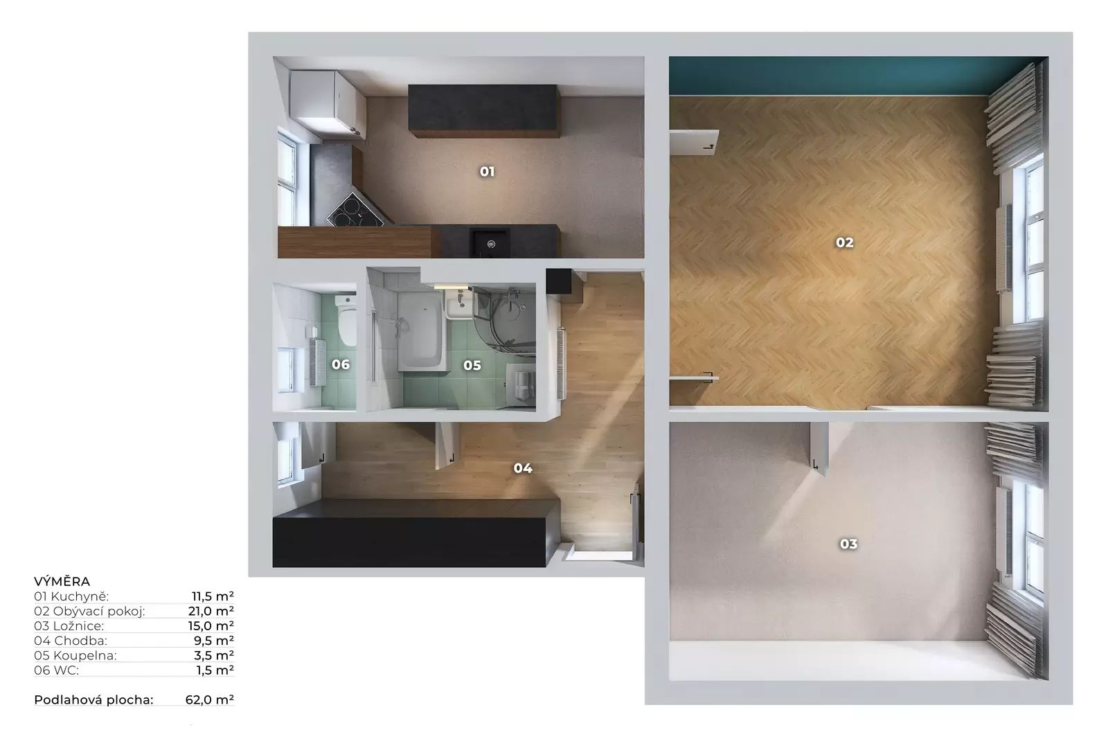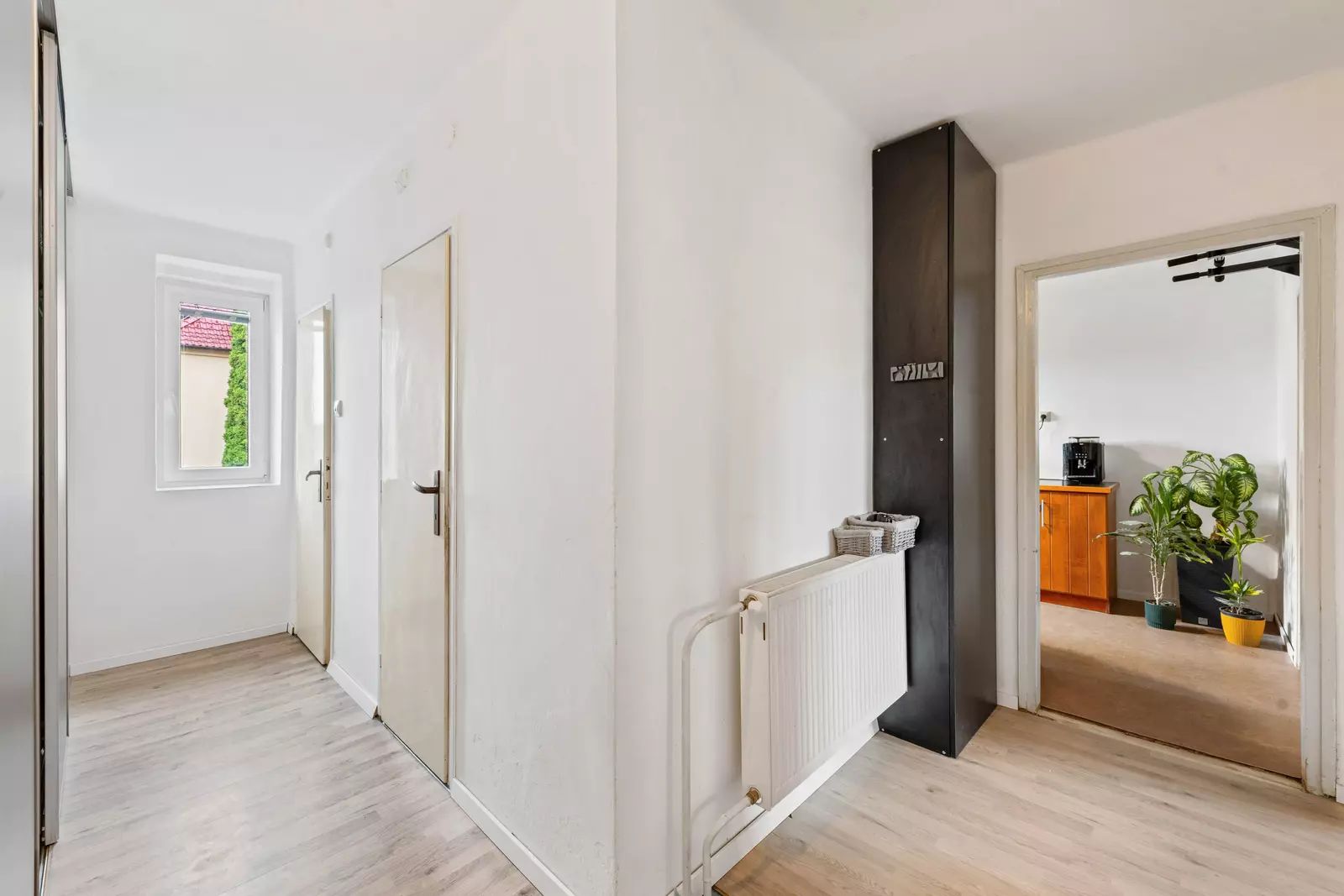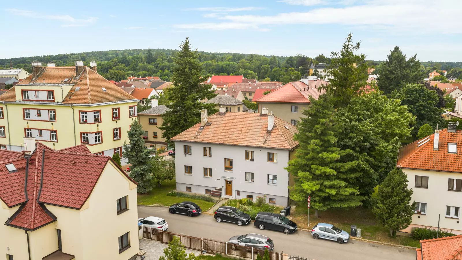Dispozice: vstupní chodba, koupelna s vanou a sprchovým koutem, samostatné WC, kuchyň, obývací pokoj, ložnice. K bytu náleží 2 sklepy v suterénu bytového domu. Jeden malý 1,5 m2 a jeden velký o velikosti 18 m2, který slouží momentálně i jako dílna. Dále je v suterénu i společná sušárna.