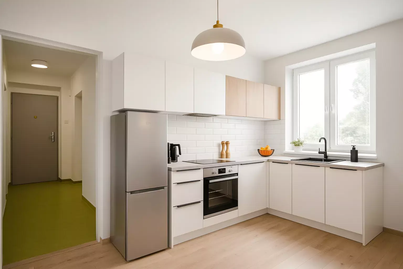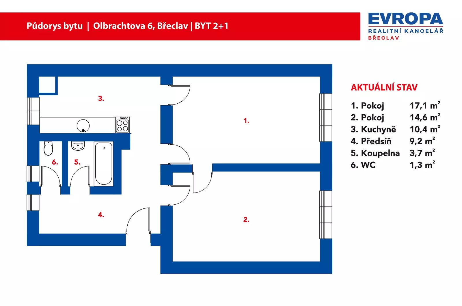 Momentální dispozice je 2+1, avšak velkým plusem je jistota v potenciálu úspory cca poloviny nákladů na úpravu vnitřní dispozice – jednoduchou přestavbou na 3+kk. Navíc přestavbou získáte cca 1 m² užitkové plochy navíc, což má v současnosti tržní hodnotu 57 000 Kč!