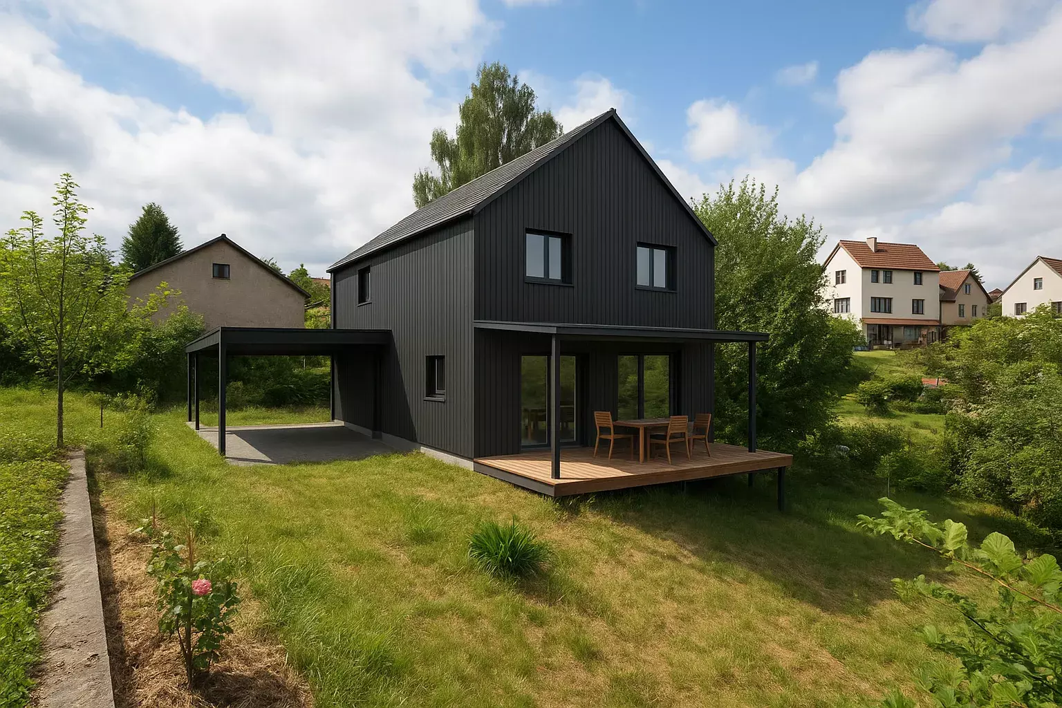 1. a 3. foto je vizualizace příkladu dřevostavby na reálném pozemku v místě a v místě, kde stával původní objekt.