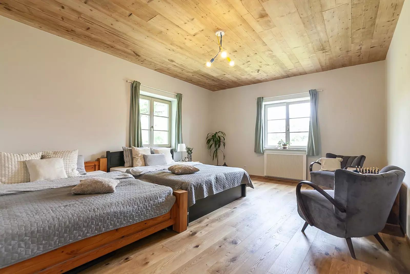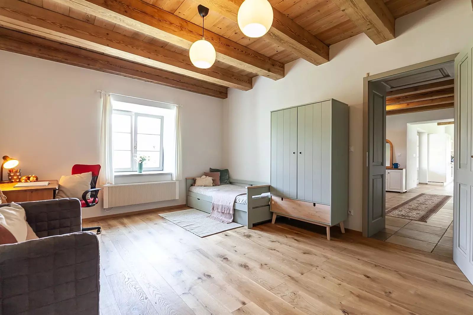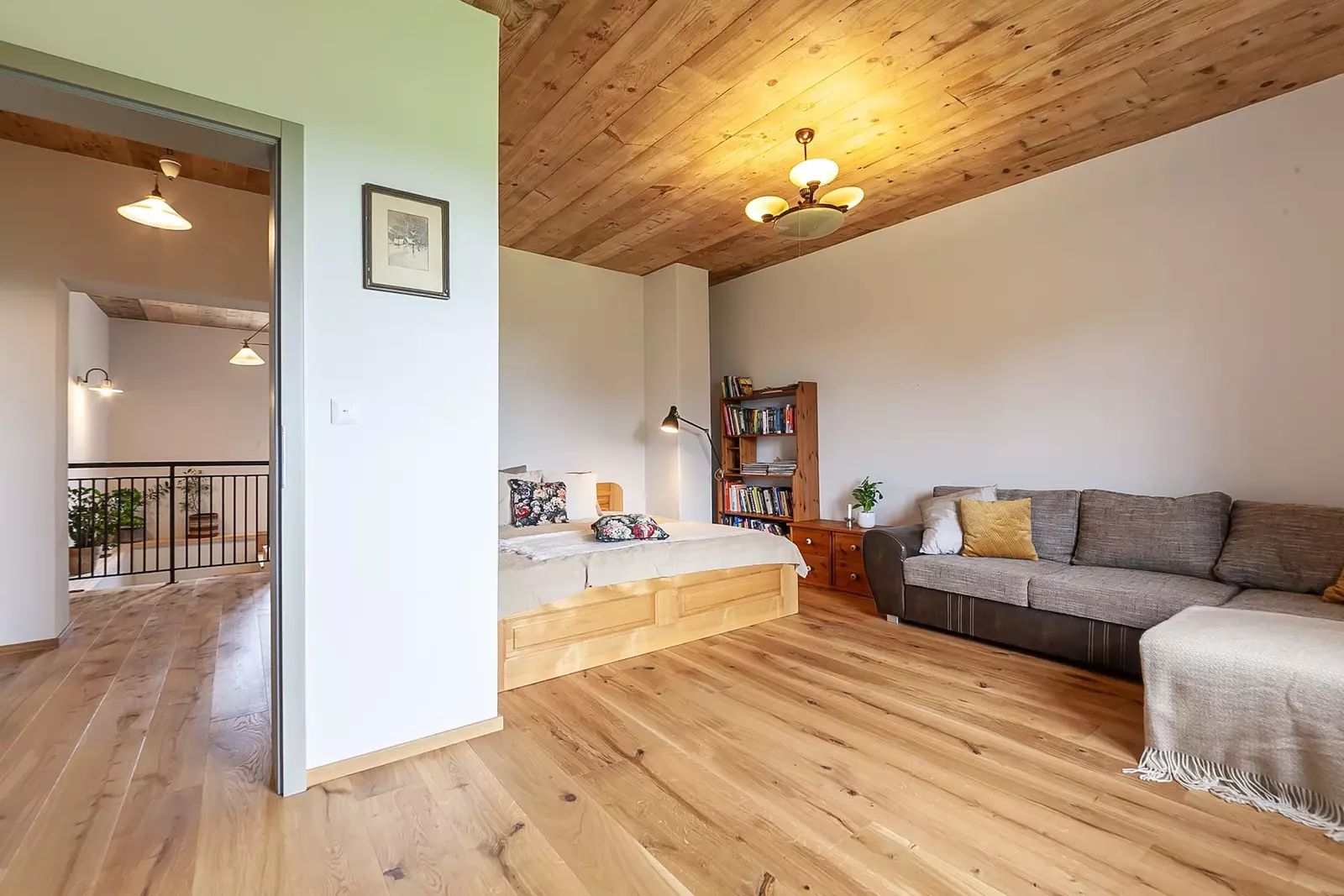 • Patro: tři světlé pokoje s výhledy do krajiny, druhá koupelna a galerie se vstupem na půdu (90 m²).