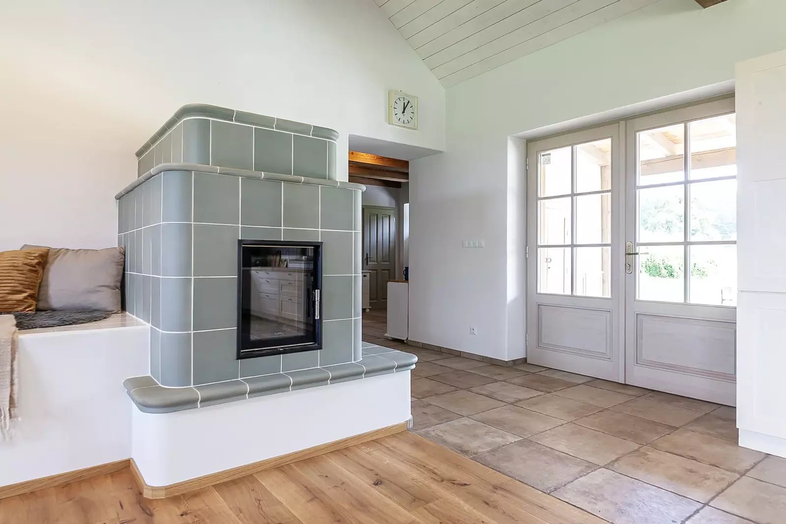 • Přízemí: velkorysý obytný prostor s kuchyní, jídelnou a obývákem, kde centrem dění jsou kachlová kamna s lavicí na ležení a akumulací tepla na celý den. Z obývacího pokoje vyjdete přímo na slunnou terasu, odkud si můžete vychutnat rána v naprostém tichu. Dále prostorná koupelna a dva pokoje.