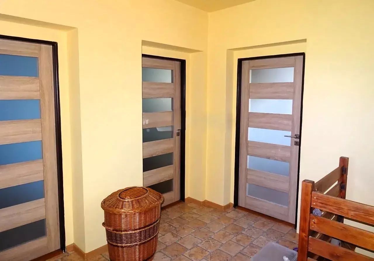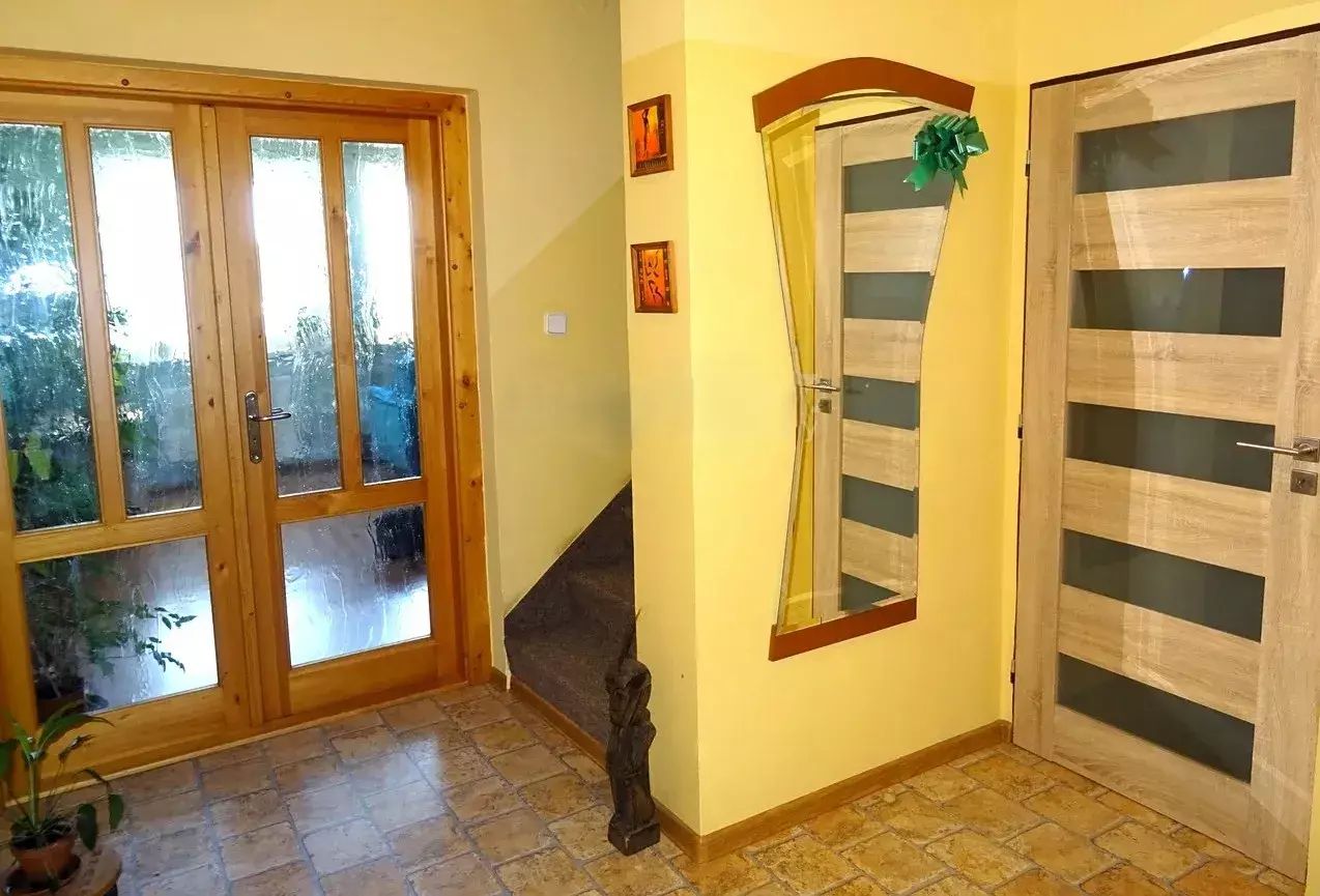 Interiér domu je rozdělen do dvou nadzemních podlaží a jednoho podzemního. V přízemí předsíň, velká koupelna se sprchou a WC, schodiště do patra a hlavní místnost-moderní kuchyň s jídelním koutem a obývací prostor s krbovými kamny. Z obývací části je vstup na zastřešenou velkou terasu s průchodem do zahrady. V patře domu je z chodby vstup do velké koupelny s vanou a WC, dále potom do čtyř samostatných pokojů, z nichž 2 mají vlastní balkony. Celý dům je podsklepený a nachází se zde garáž pro dvě auta, prádelna, technická místnost, spíž, místnost na kola a dílna. Na zahradě najdete nádherný zastřešený vyhřívaný bazén a celoroční vířivku, ohřev zajišťuje tepelné čerpadlo. Zahradu za domem dotváří romantický dřevěný altán.