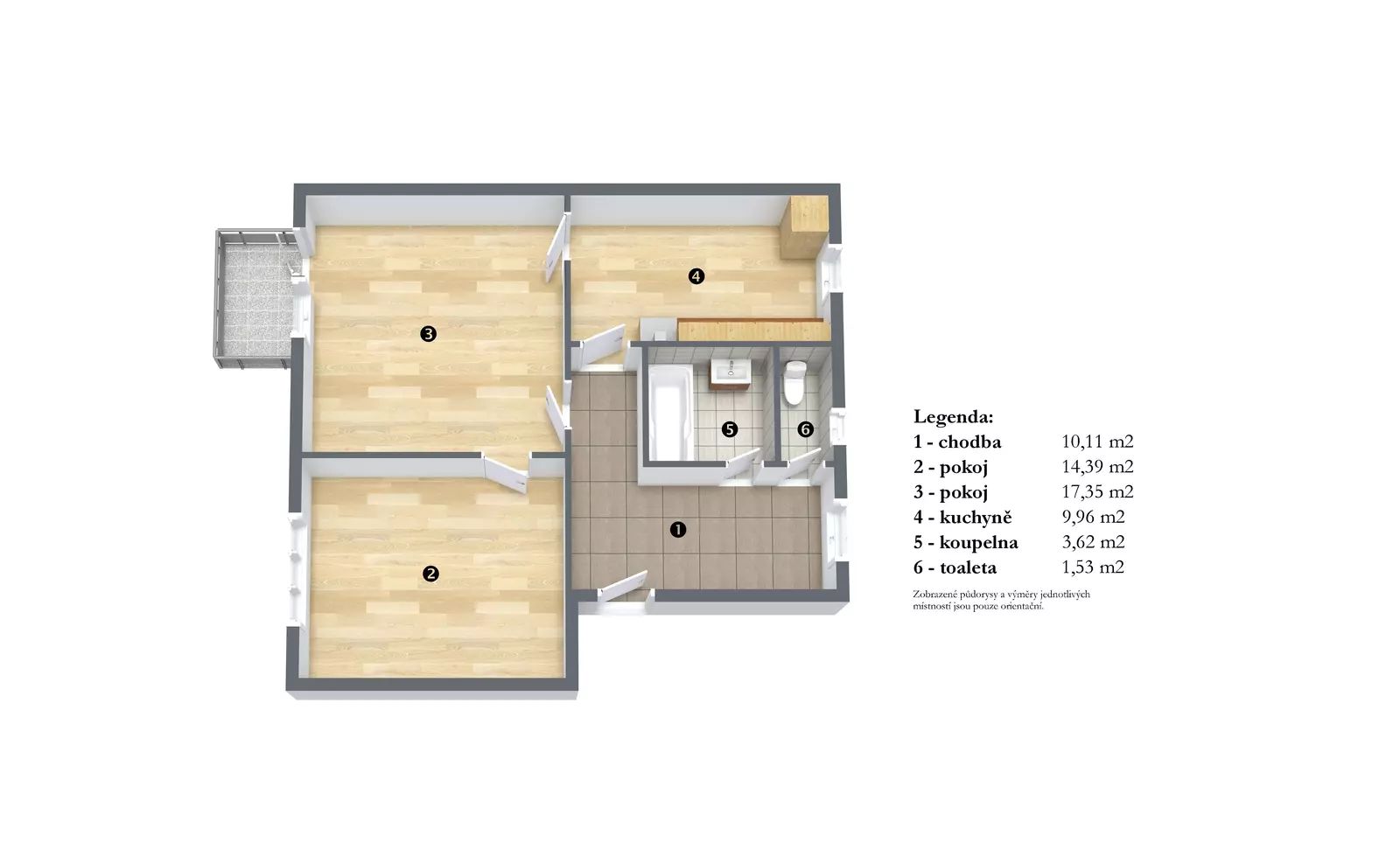 • obývací pokoj (17,35 m²) s přístupem na menší balkon