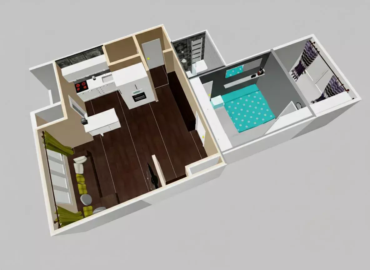 Dispozici bytu tvoří obývací pokoj s kuchyňskou linkou, ložnice (průchozí, bez oken) a pracovna nebo dětský pokoj. Z kuchyňské části je vstup na balkón (2 m²) orientovaný do klidné ulice, zatímco pracovna má okno do tichého vnitrobloku. Obě ložnice jsou vybaveny velkorysými vestavěnými skříněmi.