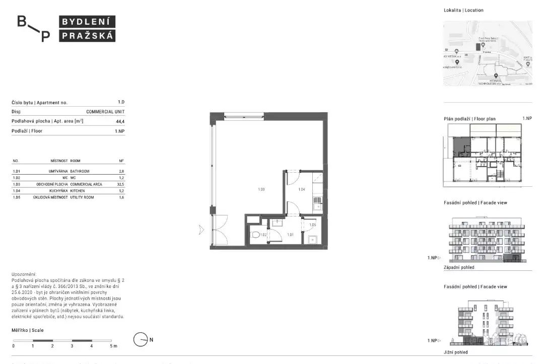 Disp.: umývárna 2,8 m2, WC 1,2 m2, obchodní plocha 32,5 m2, kuchyňka 5,2 m2, úklidová místnost 1,6 m2.