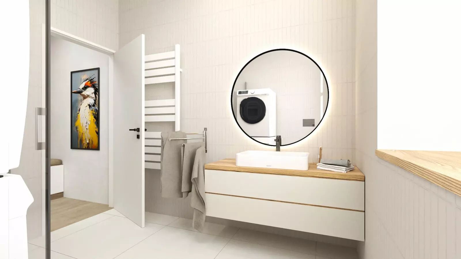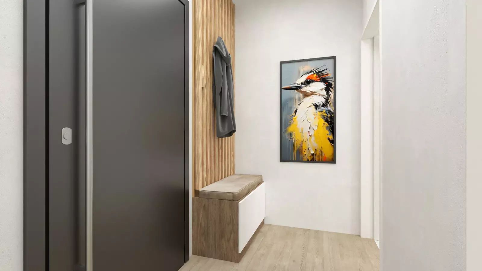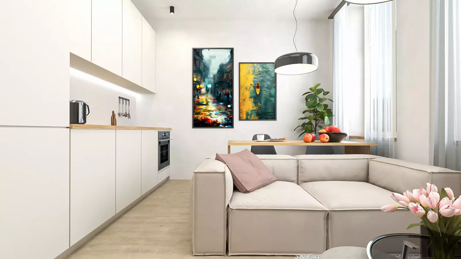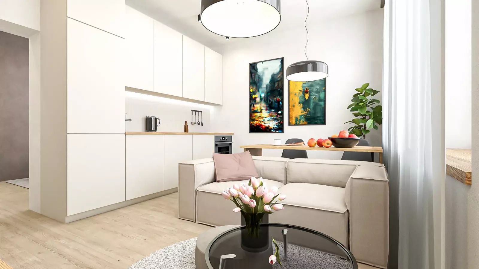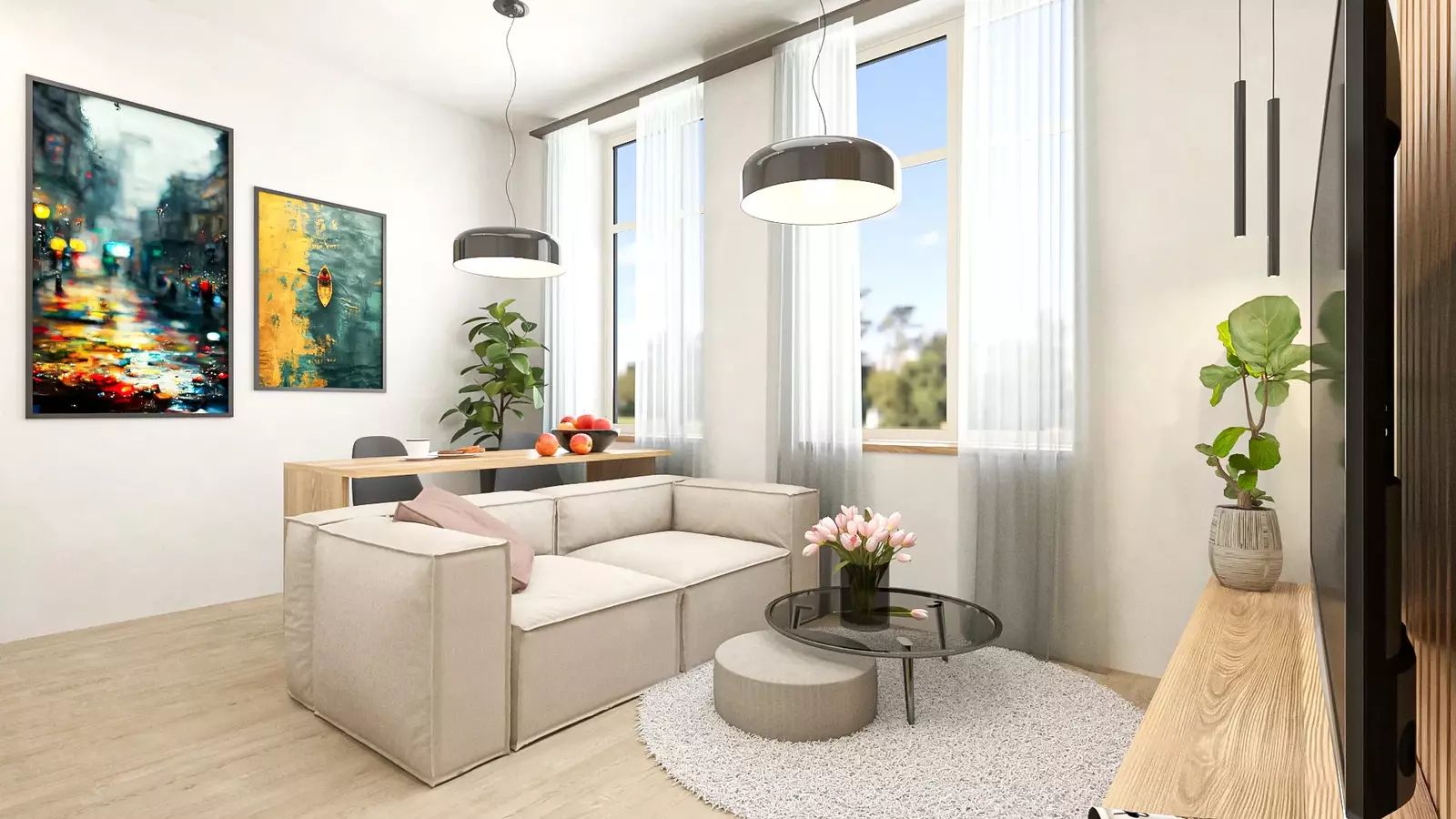 Vzdušný obývací prostor s kuchyní ložnice a koupelna se zádveřím vytvářejí pohodlí pro rodinu, pár i náročnější klienty.