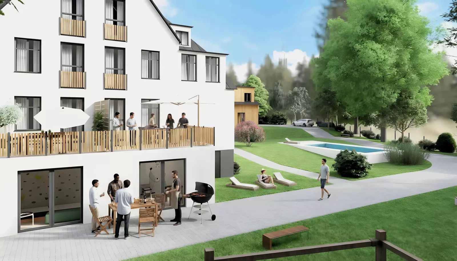 Nechybí sauna s odpočívárnou, společenská místnost, lyžárna, kolárna na zahradě a připraveno je i místo pro venkovní bazén (rozhodnutí SVJ). Parkování je standardem – včetně přípravy na elektromobil.