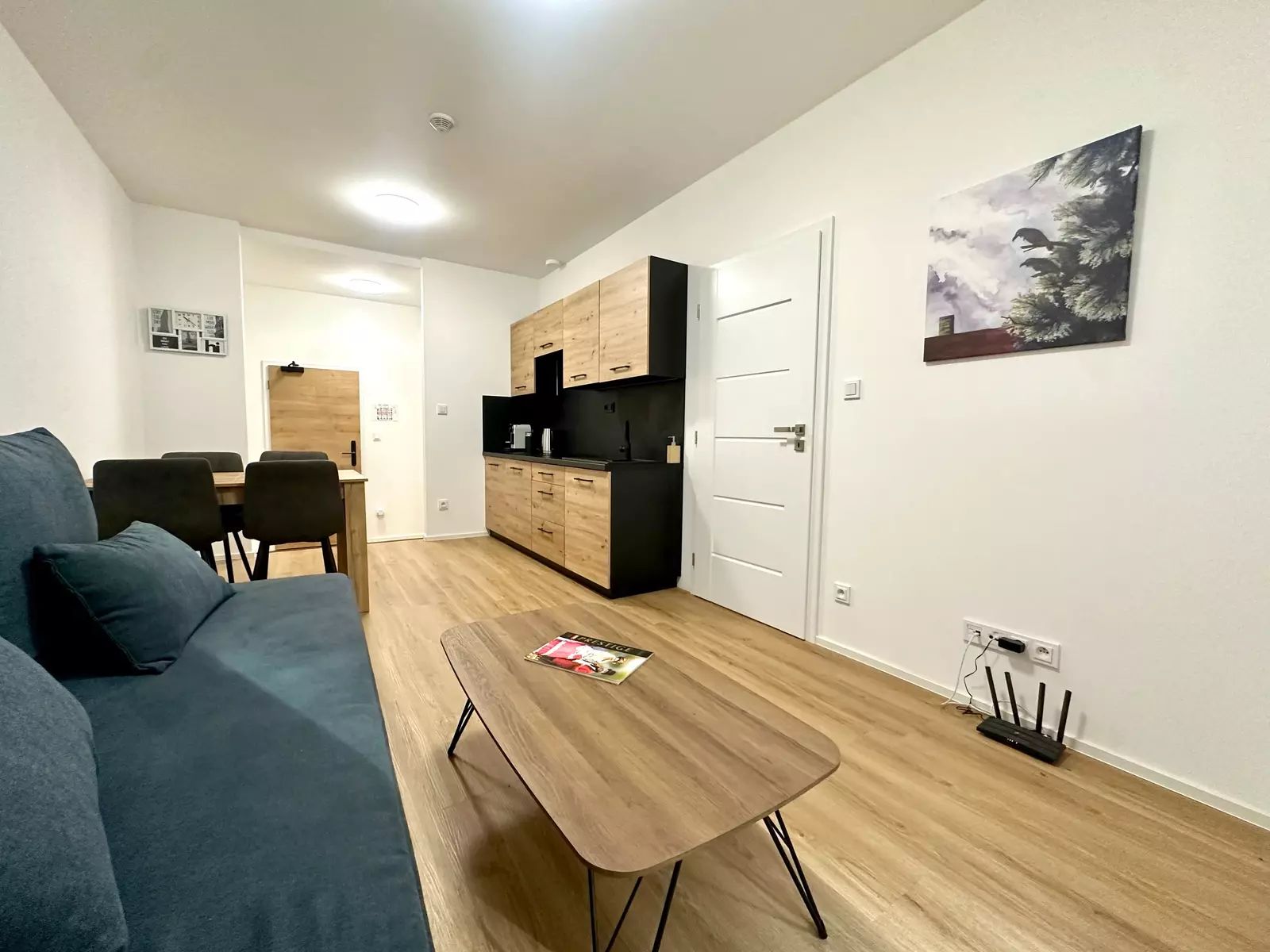 Dům je po kolaudaci, apartmán je připraven k finálnímu zařízení interiéru, v okolí domu se aktuálně připravují venkovní úpravy. V domě najdete saunu, venkovní bazén, rodinnou atmosféru a příjemné sousedy, což přispívá ke komfortnímu bydlení. Vytápění i ohřev teplé vody tepelným čerpadlem.