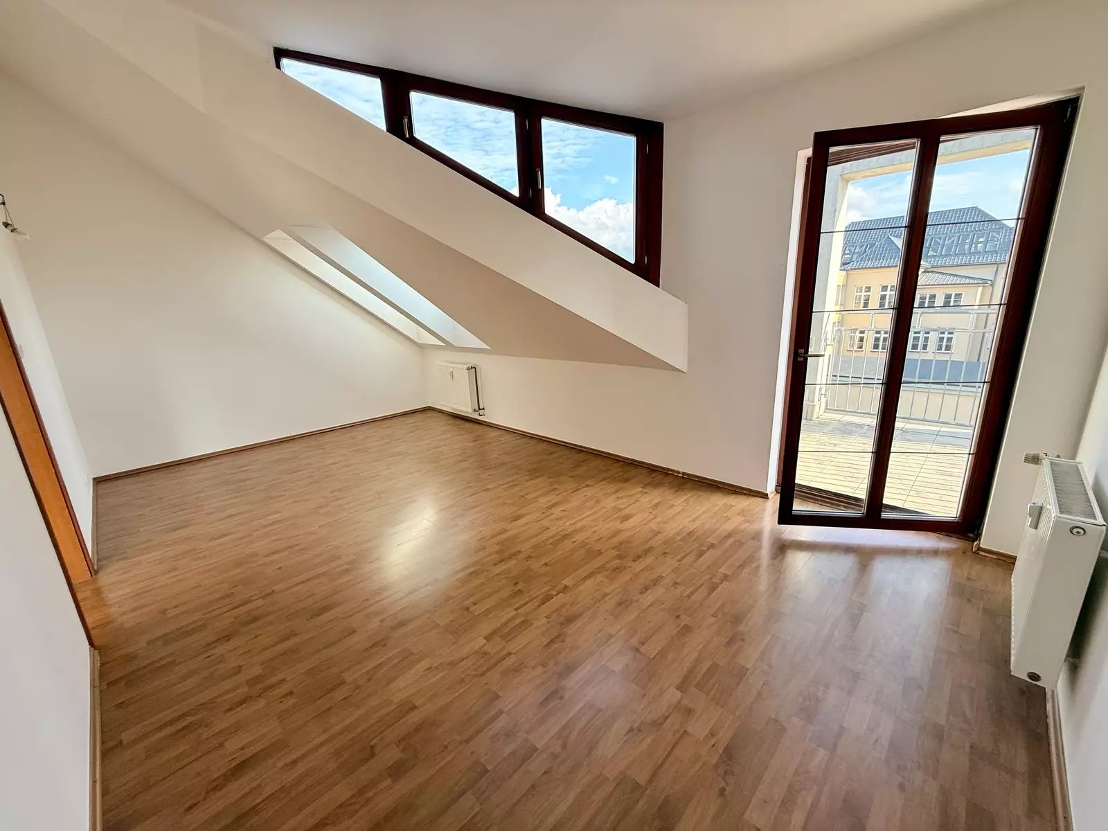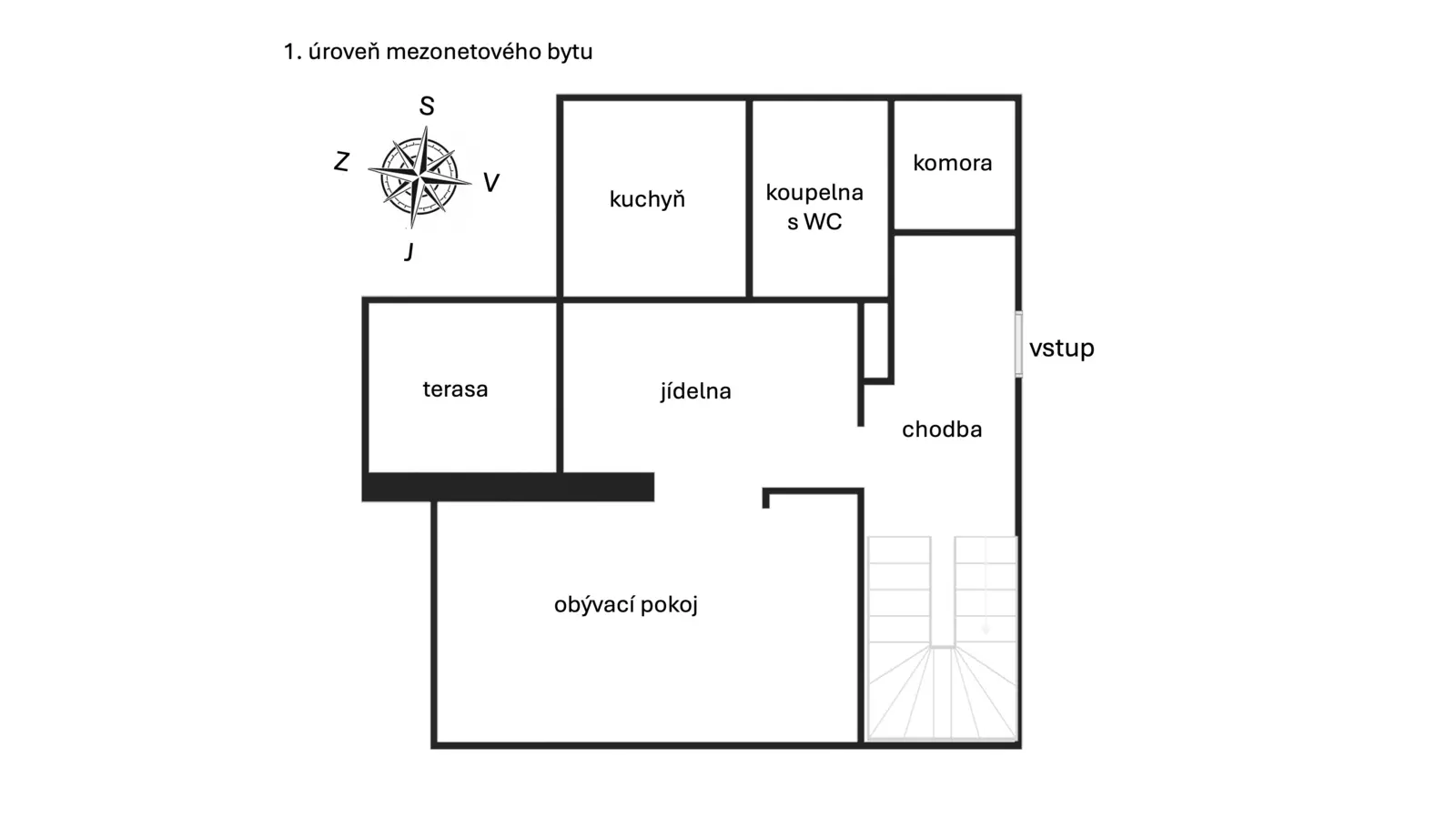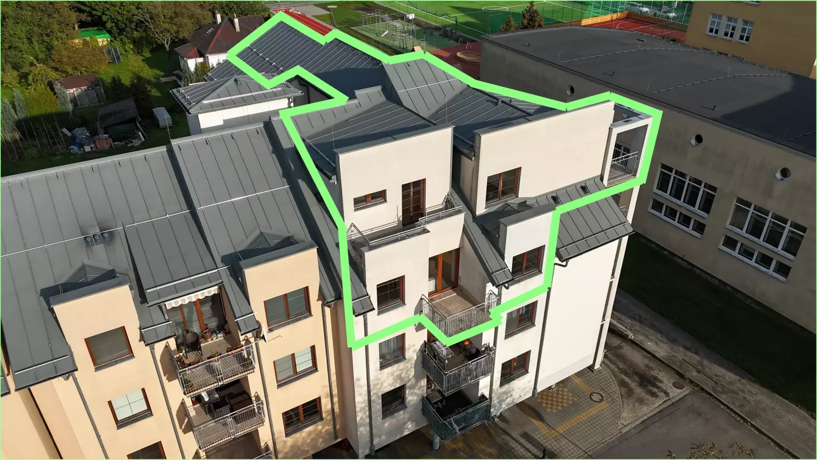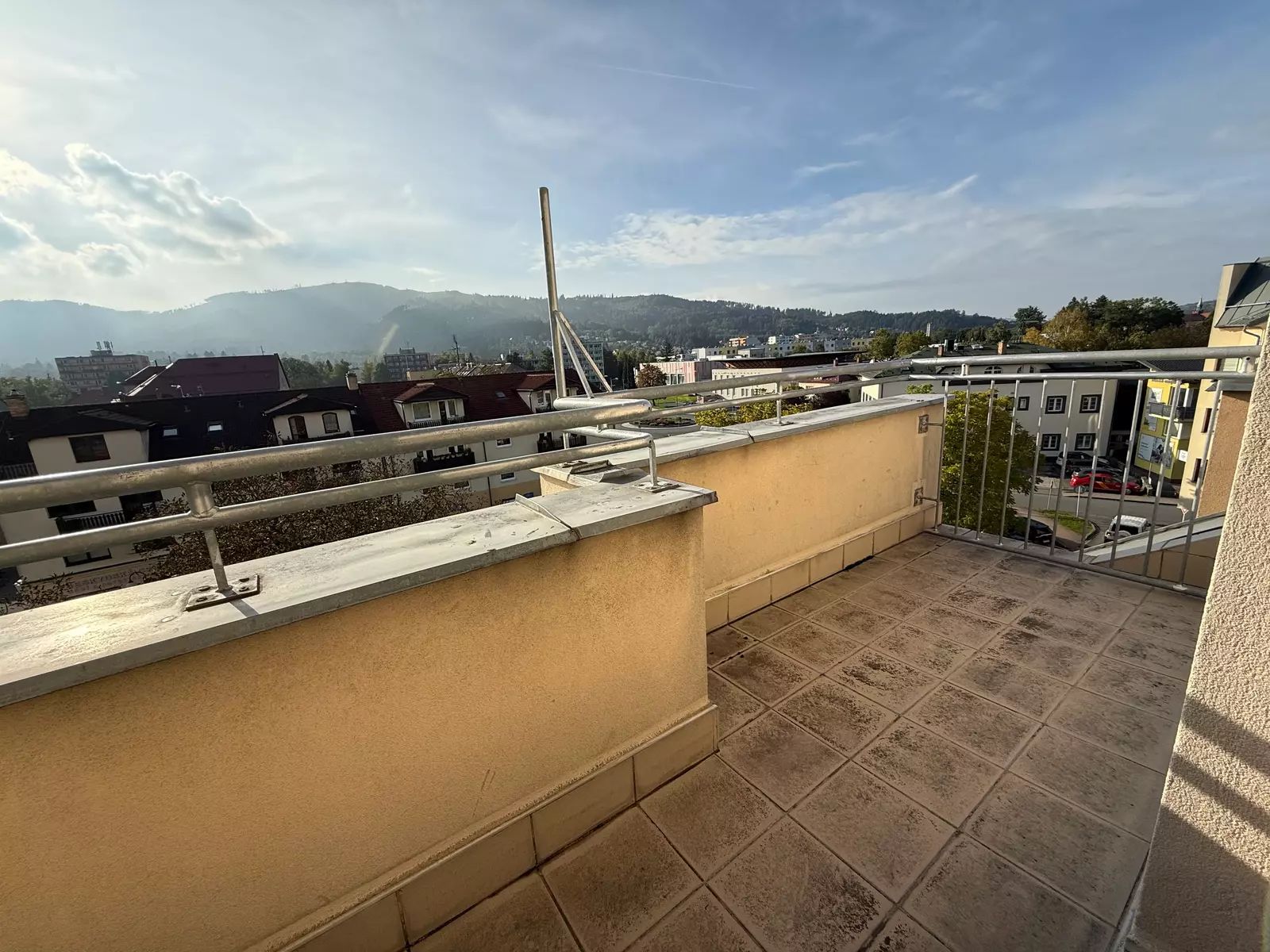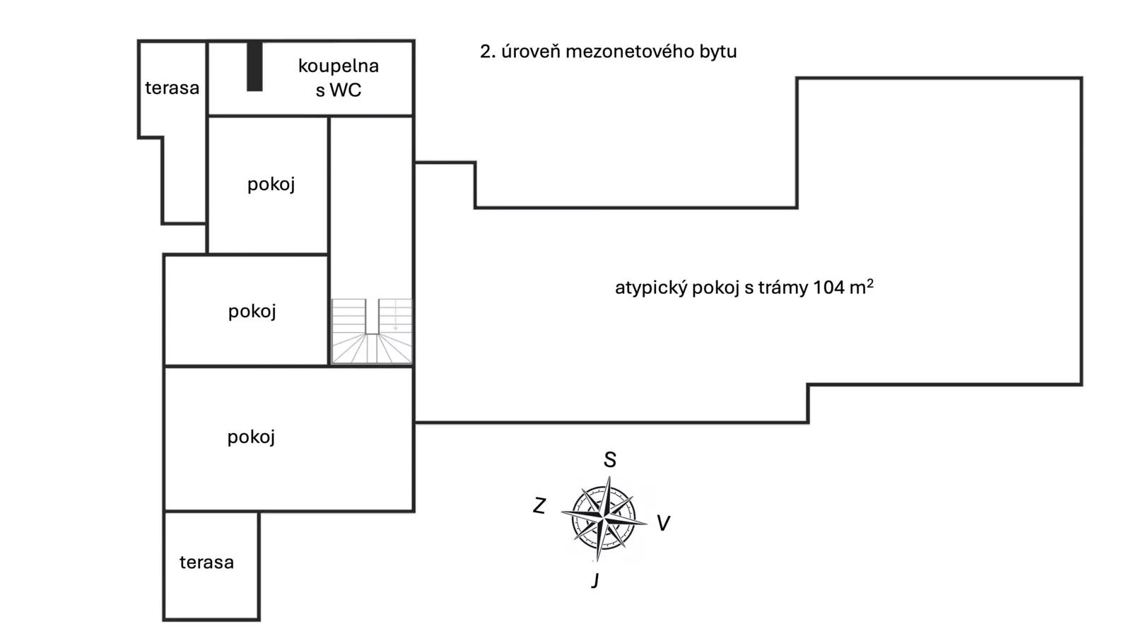 Byt je mezonetový s okny a terasami orientovanými jižním a západním směrem. V první úrovni se nachází samostatná kuchyně s přilehlou obývací místností s dostatečným prostorem pro umístění jídelny, ze které můžete vyjít na terasu – 5,6 m2 a dát si kávu či oběd i tady. Dále je zde umístěna koupelna s vanou a toaletou. Ve vstupní chodbě jsou dvě vestavěné skříně a komora, kterou lze využít i jako šatnu. Po dřevěném schodišti se dostane do podkroví, kde je umístěna další koupelna s vanou a toaletou. Dále se zde nachází čtyři obytné místnosti. Ze dvou ložnic máte výstup na samostatné terasy (5,8 m2 a 5,9 m2), které nabízí soukromí a nádherné výhledy do okolí. Největší podkrovní místnost 104 m2 plná střešních oken orientovaných jižním směrem nabízí různorodé využití, vytvoření ateliéru či jejího rozdělení na více místností. Součástí bytu jsou také dvě garážová stání v podzemní garáži domu, což je v centru města obrovskou výhodou.