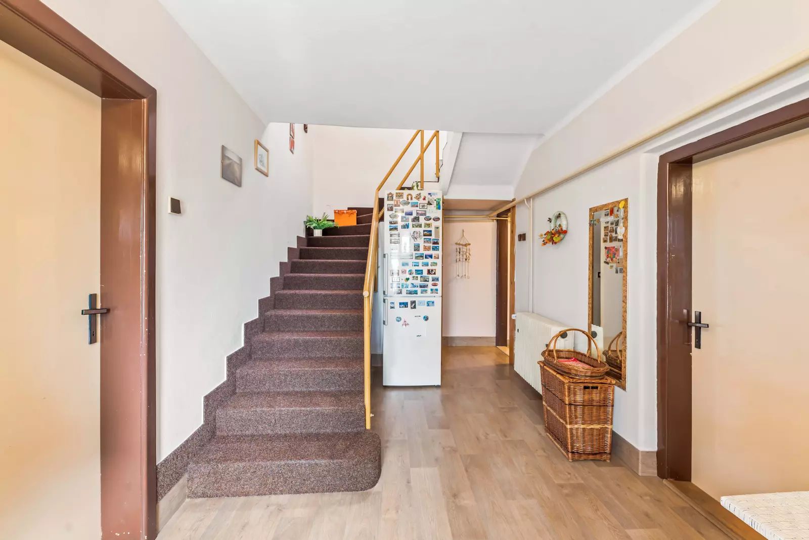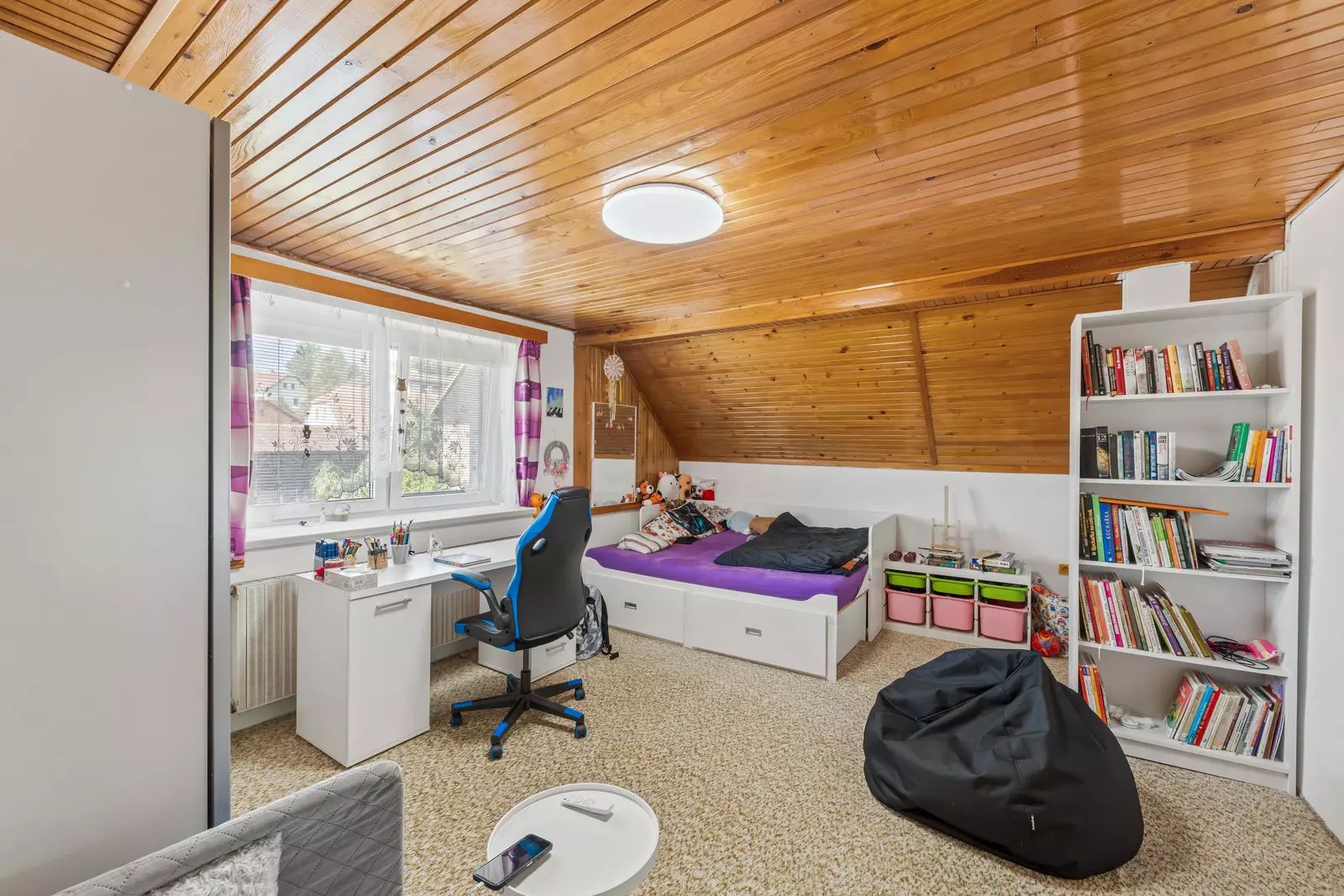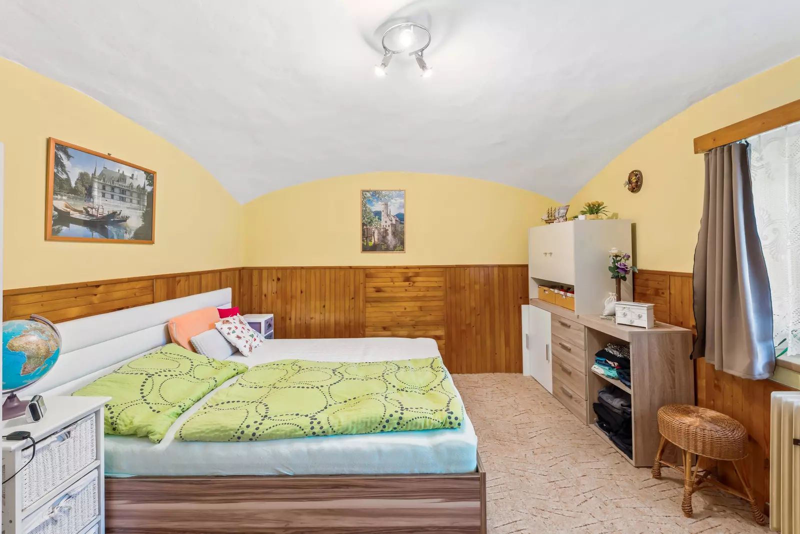 Podkroví nabízí ložnici (8,76 m2), moderní kuchyni s jídelnou (13,39 m2), pokoj s šatnou (33 m2) a prostorný půdní prostor. V domě jsou nová plastová okna a podkroví je zateplené foukaným polystyrenem.