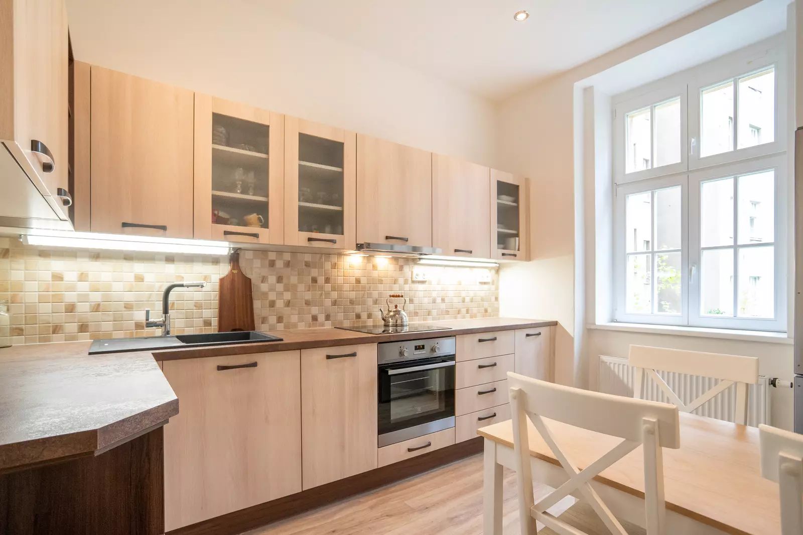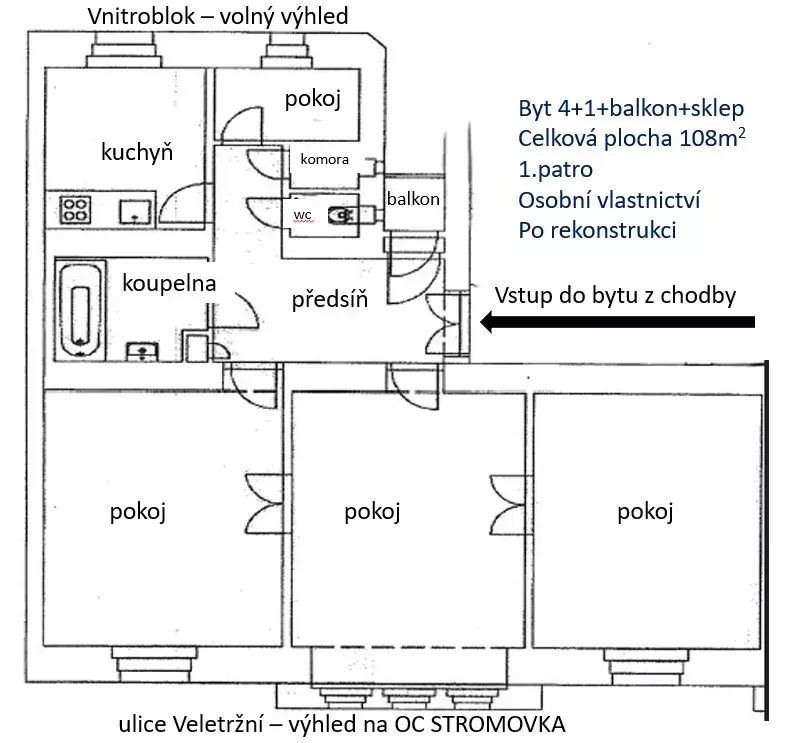 Exkluzivně nabízíme prodej světlého luxusního bytu 4+1 v prvorepublikovém domě ve Veletržní ulici, Praha 7. Nevšední byt o celkové užitné ploše 108 m², situovaný v prvním patře činžovního domu z roku 1945 prošel kompletní nákladnou rekonstrukcí před cca 5ti lety s respektováním historických prvků (dvoukřídlé dveře, dubové parkety,..)- včetně oken, dveří, obložení, podlah, vytápění včetně těles po bytě, rozvodů, koupelny a sanitárního vybavení, kuchyně. Náklady rekonstrukce byly téměř 3miliony Kč. Byt se prodává včetně vybavení dle foto. Koncepce bytu je ideální, z prostorné haly vcházíte do téměř všech místností (3 pokoje, koupelna, kuchyň, WC, technická, balkon)- byt by umožňoval i vícegenerační bydlení. Byt kromě prostorné haly tvoří 3 velké a 1 malý pokoj, samostatná kompletně vybavená prostorná kuchyň s moderními spotřebiči, koupelna s vanou, sprchovým koutem a novým kotlem, samostatné WC, samostatnou komoru a malý balkon. K bytu náleží i prostorný sklep. Byt má část oken do ulice a část do dvora, je perfektně větratelný a světlý. Parkování pro rezidenty Prahy 7 je umožněno v OC Stromovka za zvýhodněných podmínek.