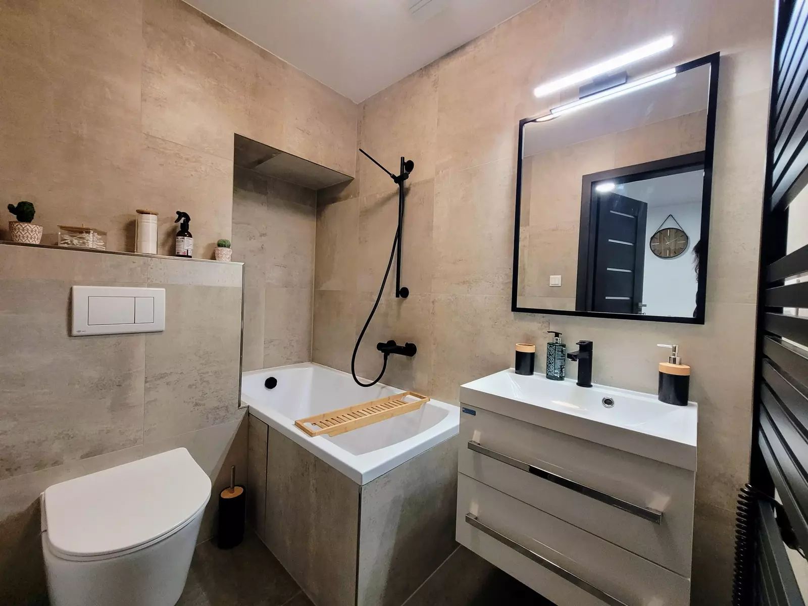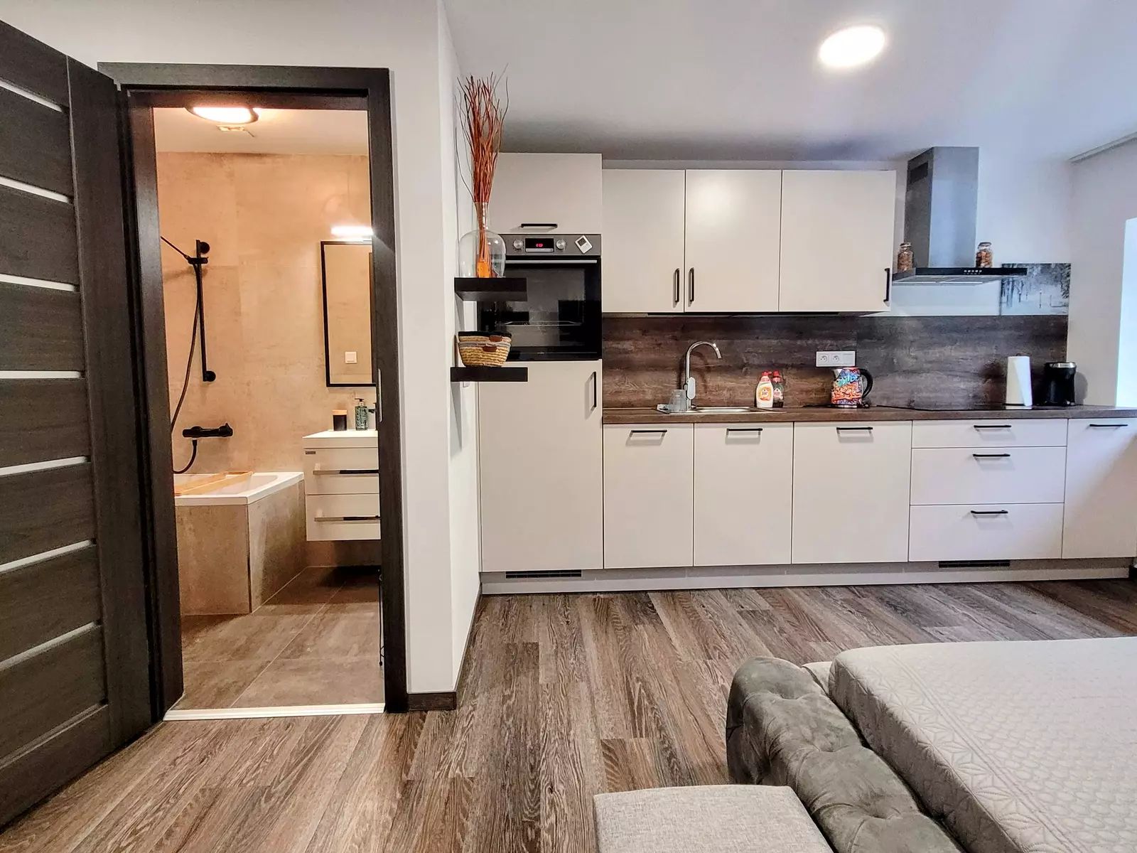 Apartmán disponuje obývacím pokojem s kuchyňským koutem a místem na spaní, koupelnou s toaletou, situován ve třetím patře zděného domu.