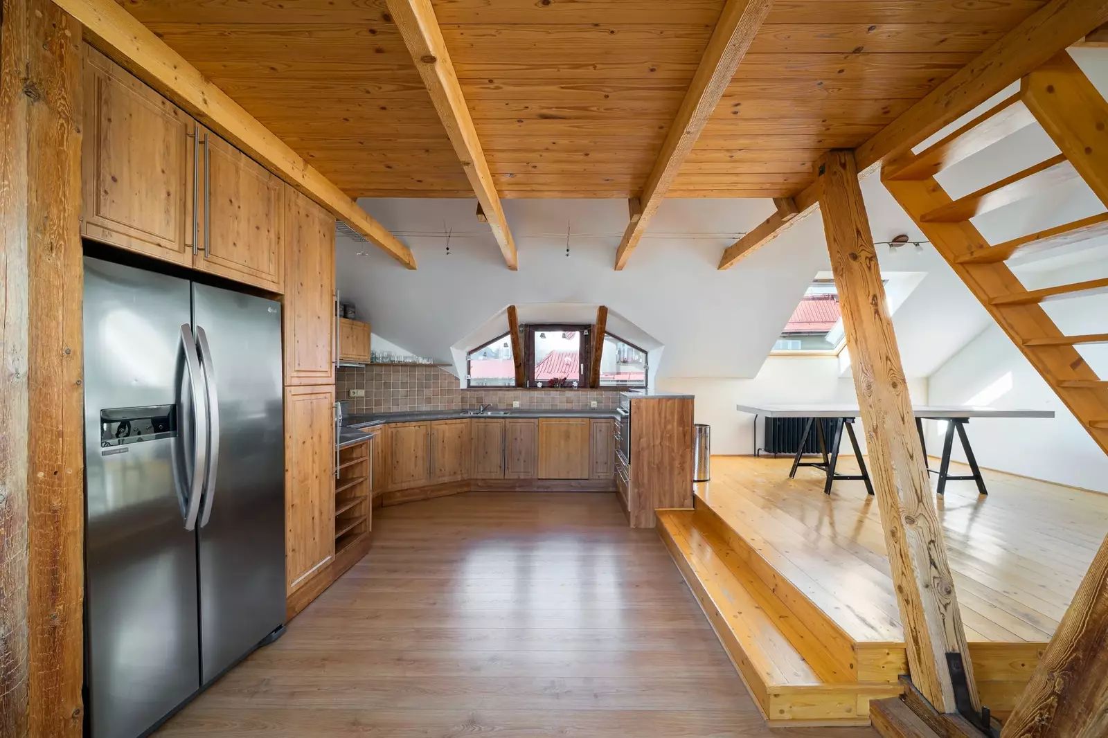 - Moderní kuchyňská linka plně vybavená spotřebiči (trouba, varná deska, myčka, lednice, mikrovlnná trouba)