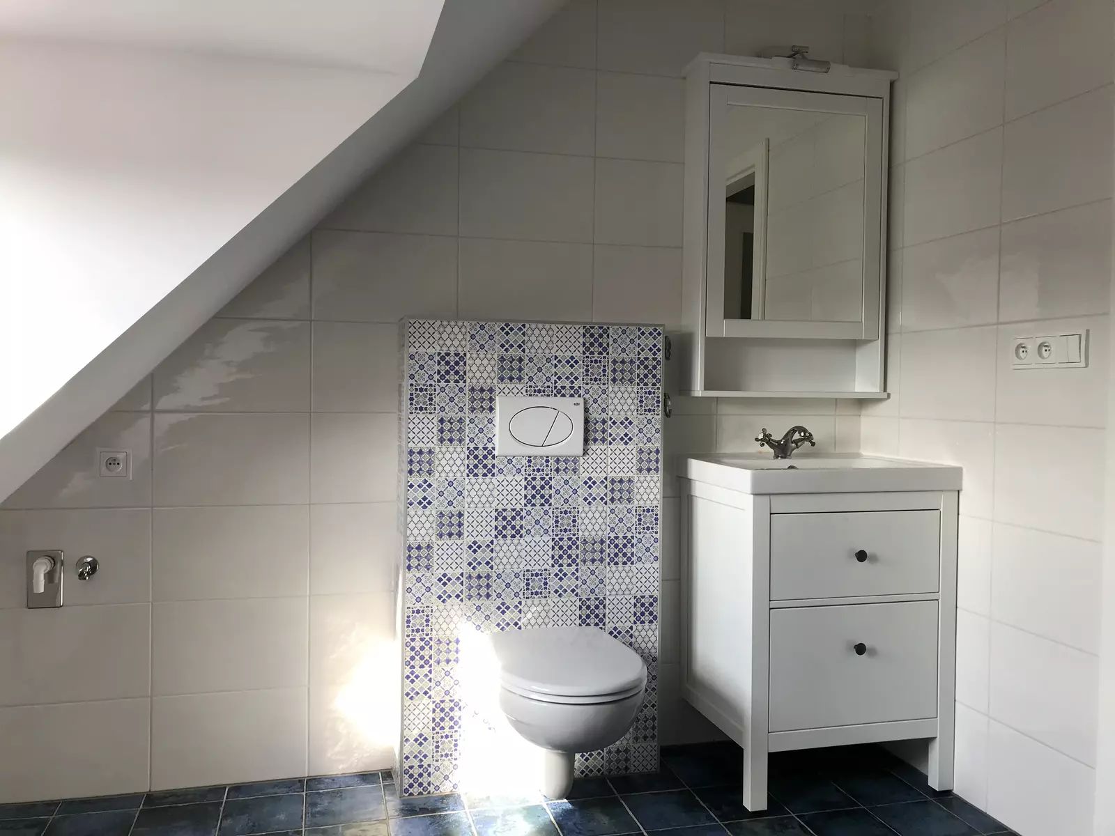 Ze vstupní chodby je přístup do všech místností – prostorného obývacího pokoje s kuchyňským koutem, koupelny se sprchovým koutem a WC, ložnice a šatny. Šatna má okno a lze ji využít i jako malý pokoj pro příležitostné přespání.