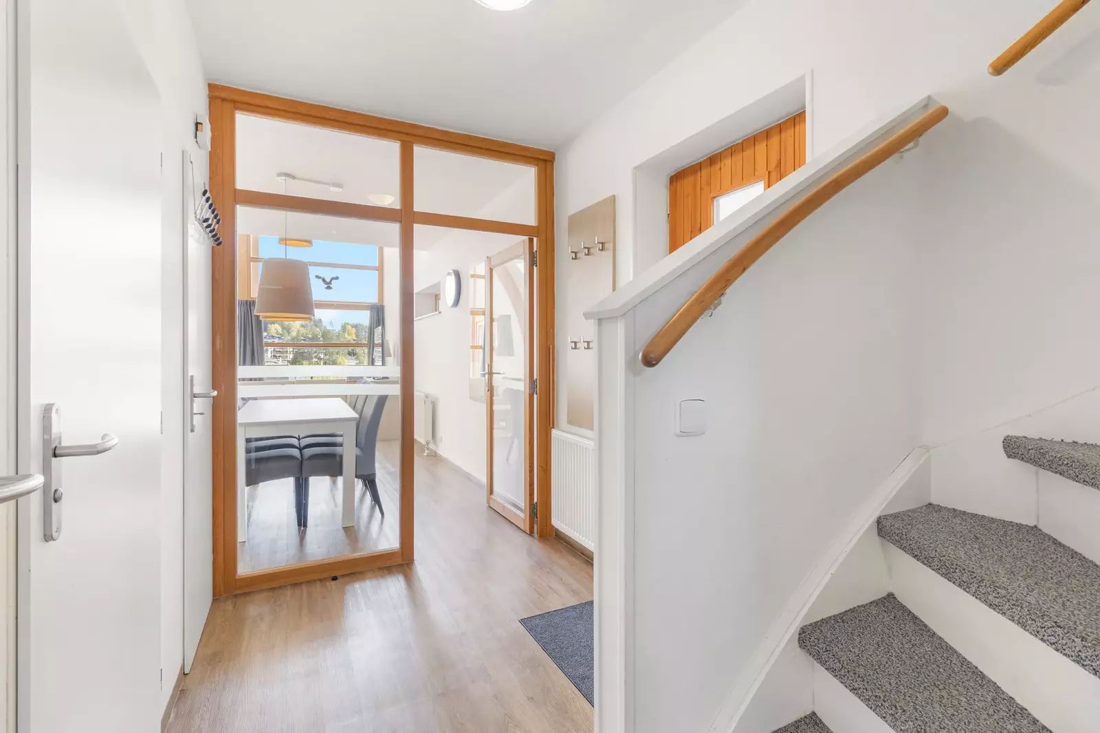 Vstupní podlaží tvoří prostorná hala, na ni navazuje hlavní obytná část s kuchyní, jídelnou a obývacím prostorem, ze kterého je přímý vstup na balkon s nádherným výhledem na přístaviště a jezero. V této úrovni se nachází i koupelna, samostatné WC a ložnice s praktickou šatnou, špíž a samostatná úklidová místnost.