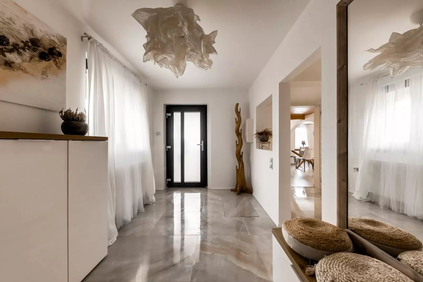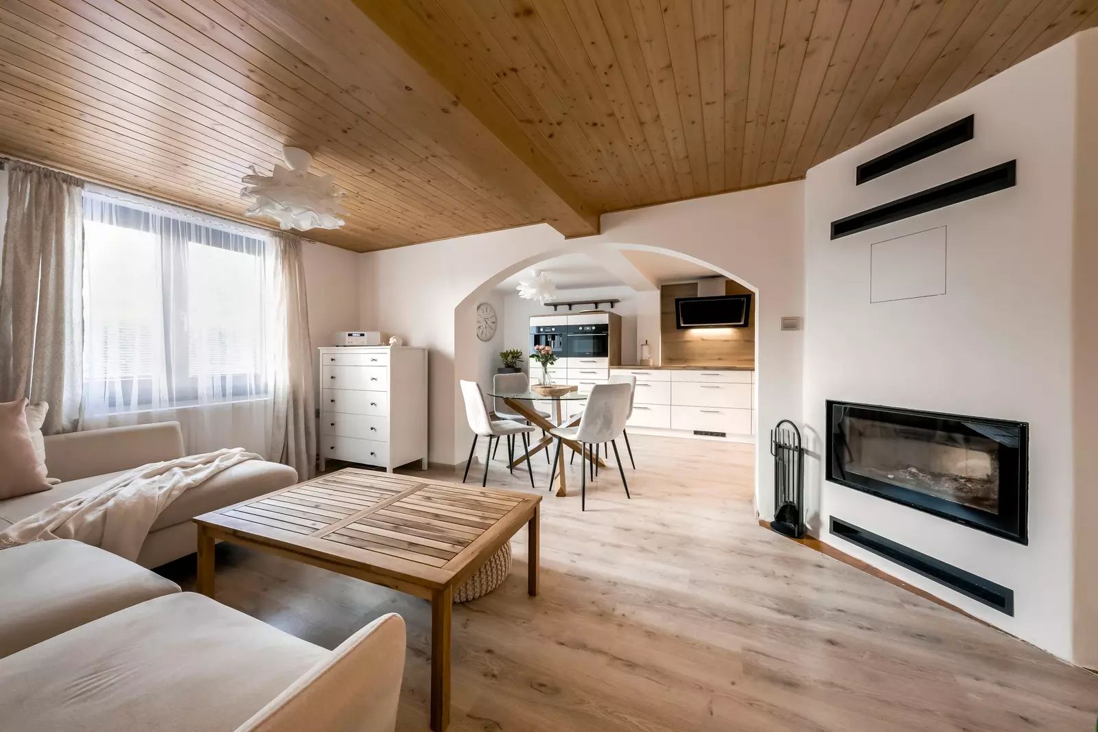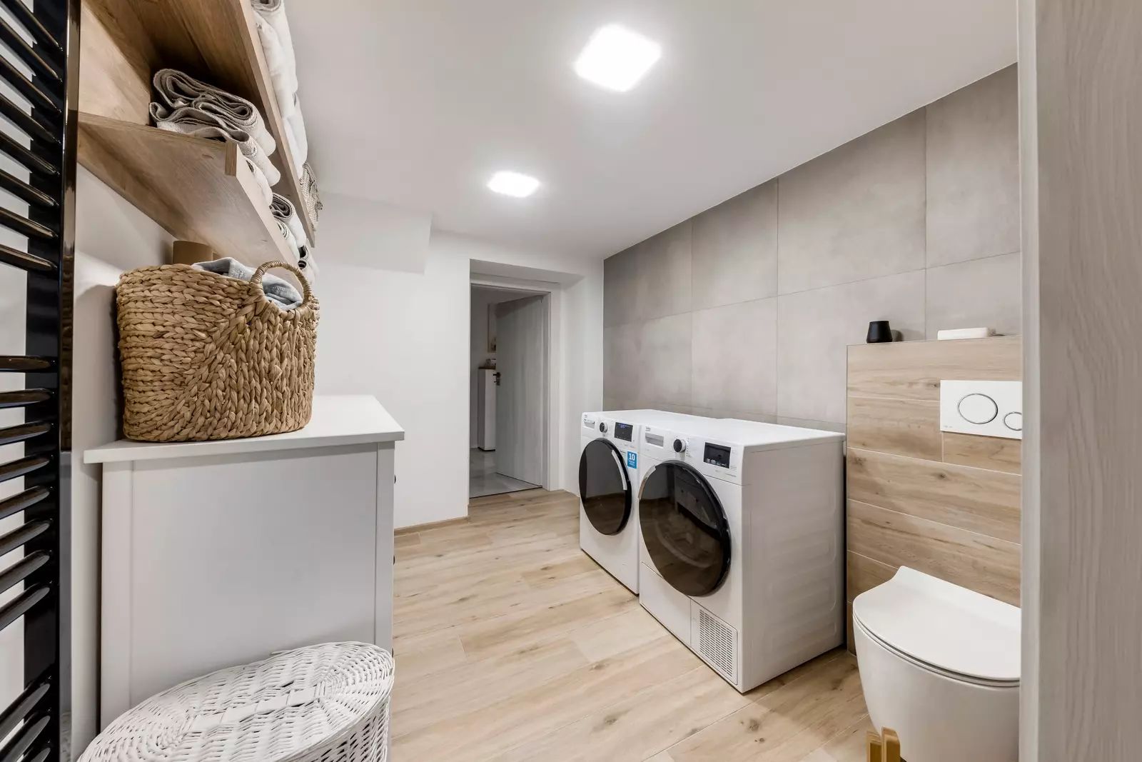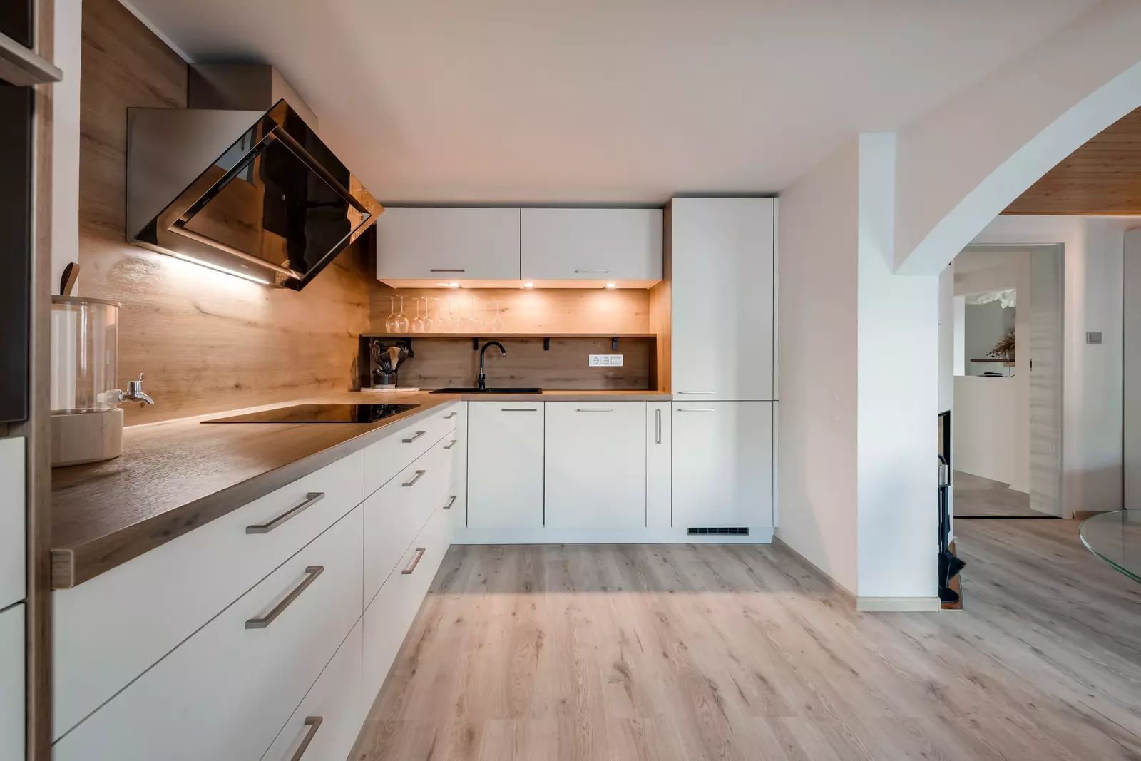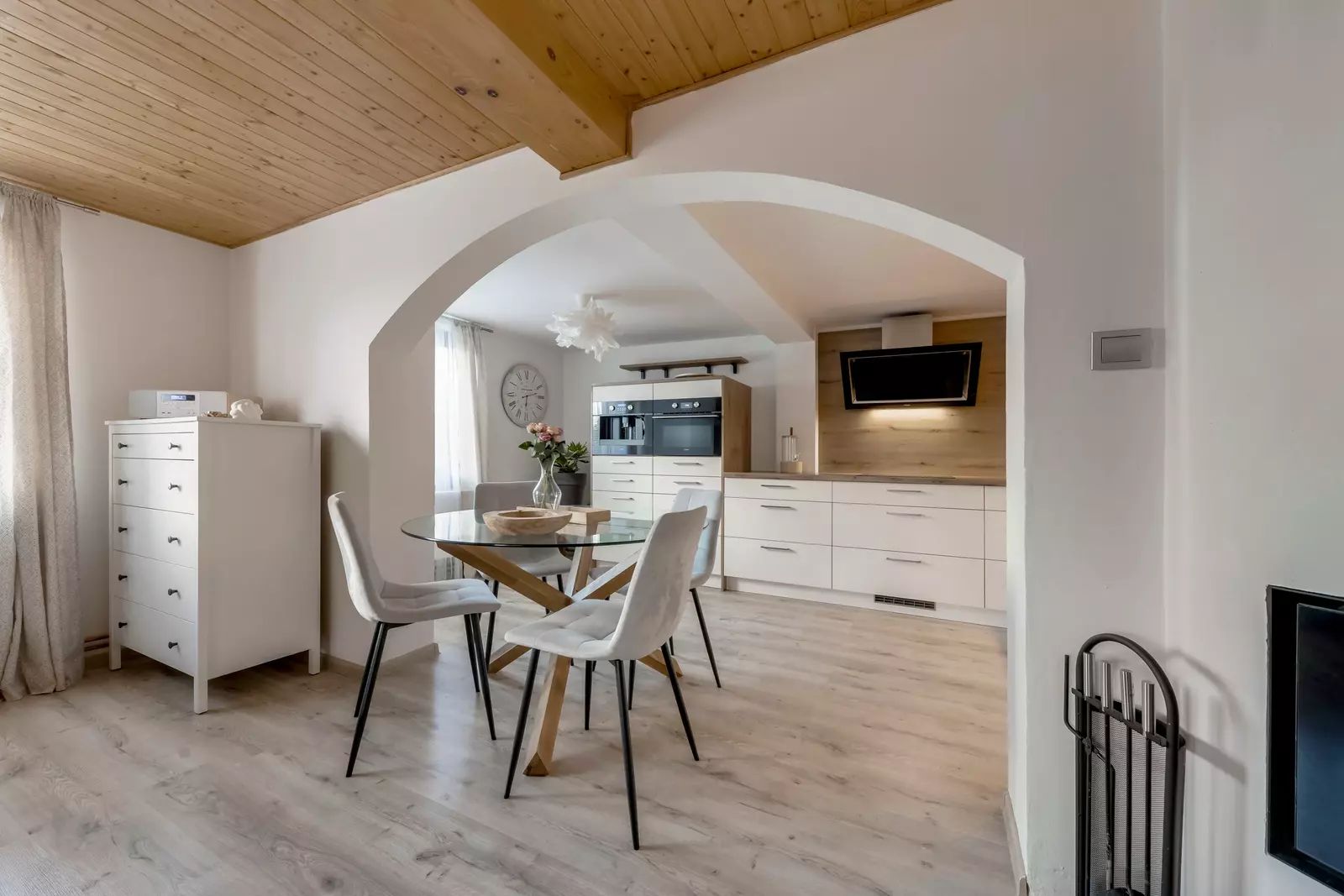 Interiér je dokonalým propojením dřeva, doplněné o designovou dlažbu, luxusní spotřebiče a hlavně je zde na každém kroku cítit otisk vkusného a praktického využití každého koutu.