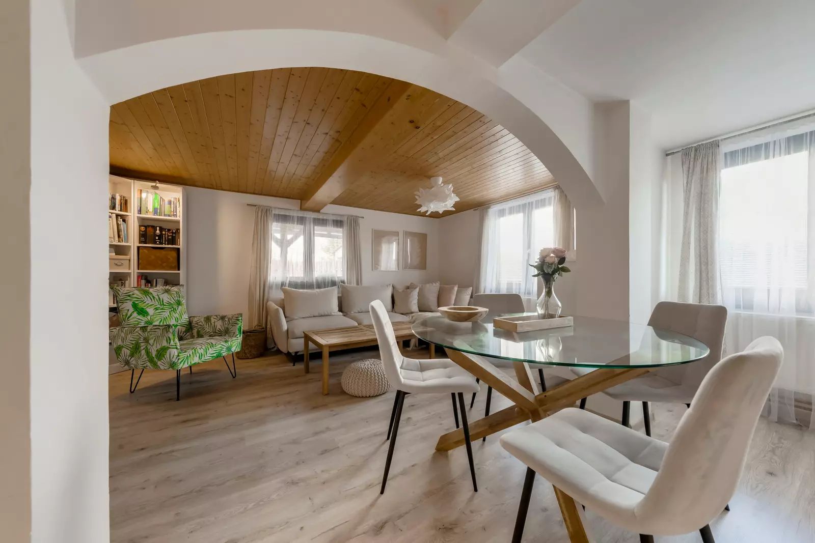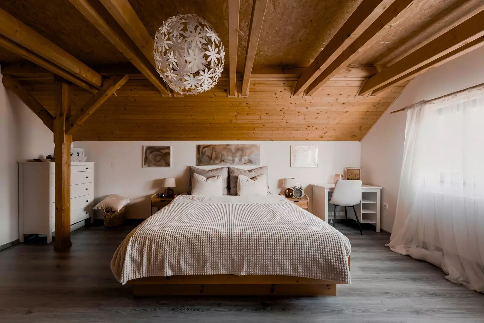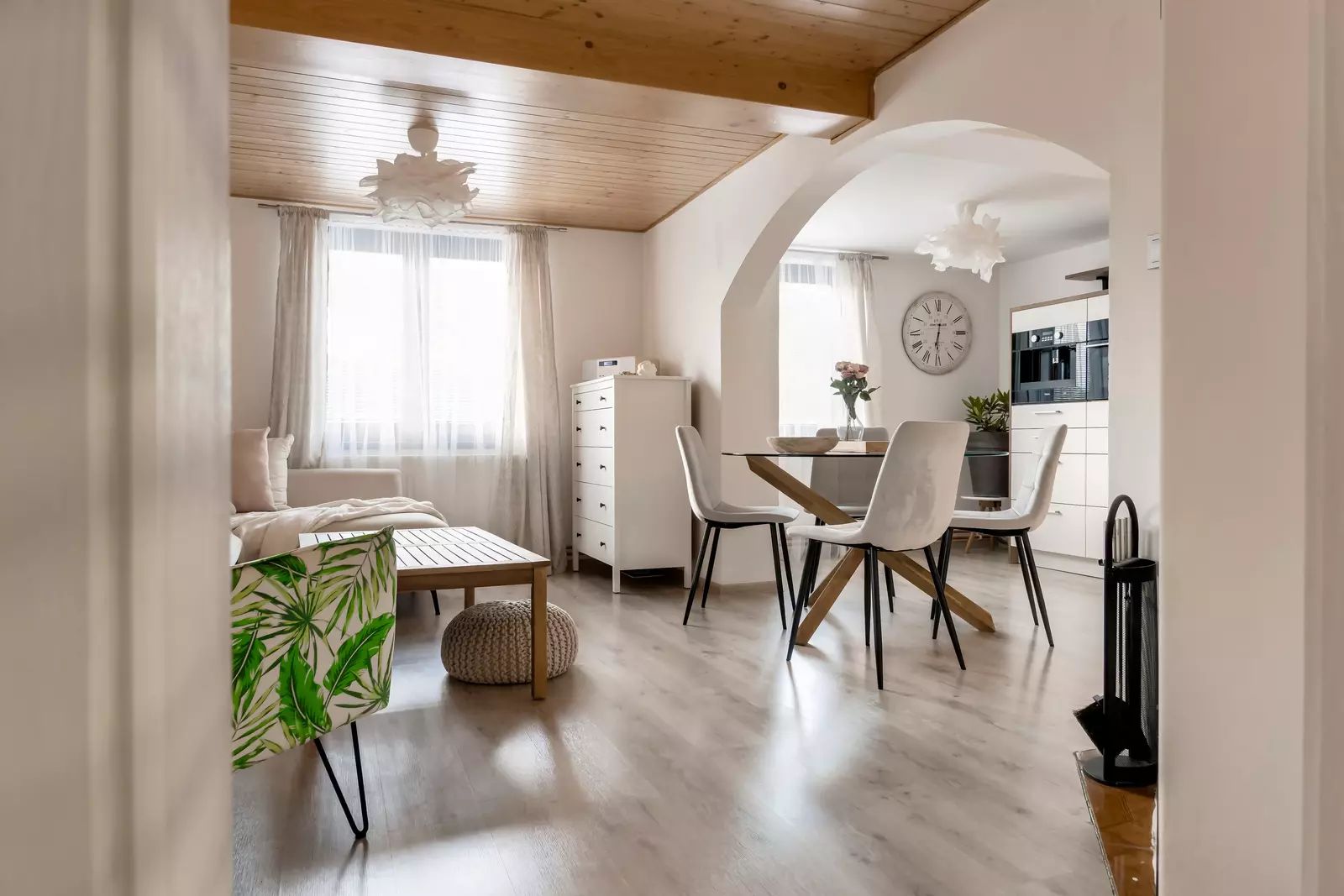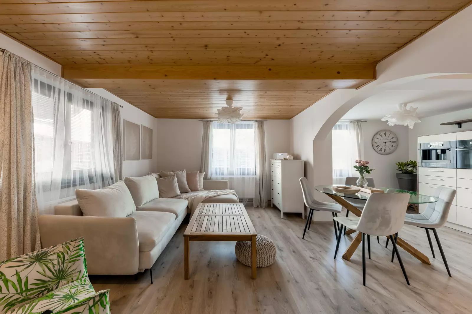 Interiér je dokonalým propojením dřeva, doplněné o designovou dlažbu, luxusní spotřebiče a hlavně je zde na každém kroku cítit otisk vkusného a praktického využití každého koutu.