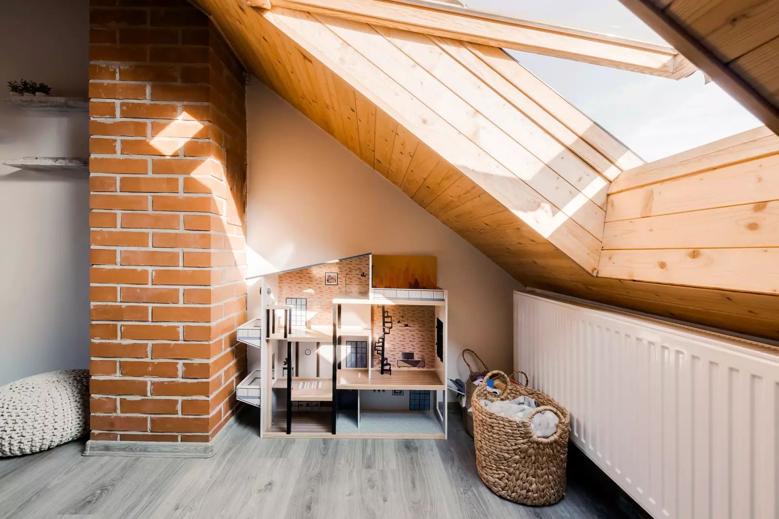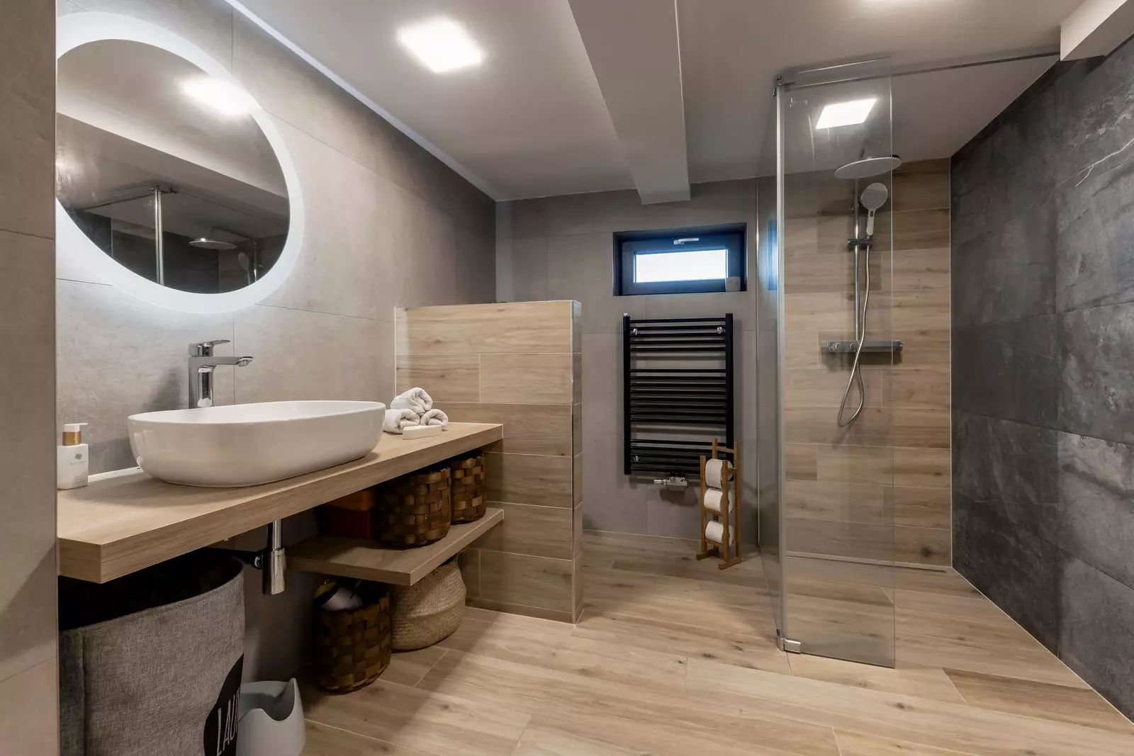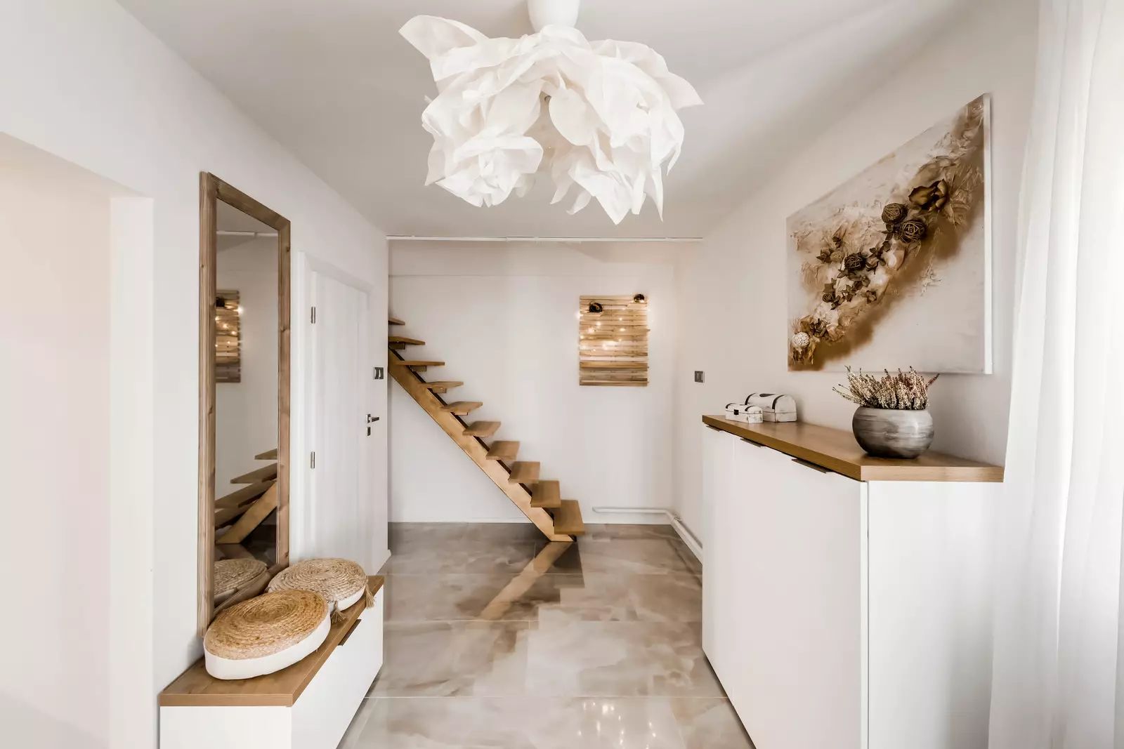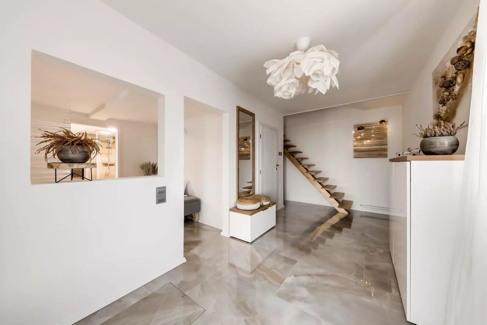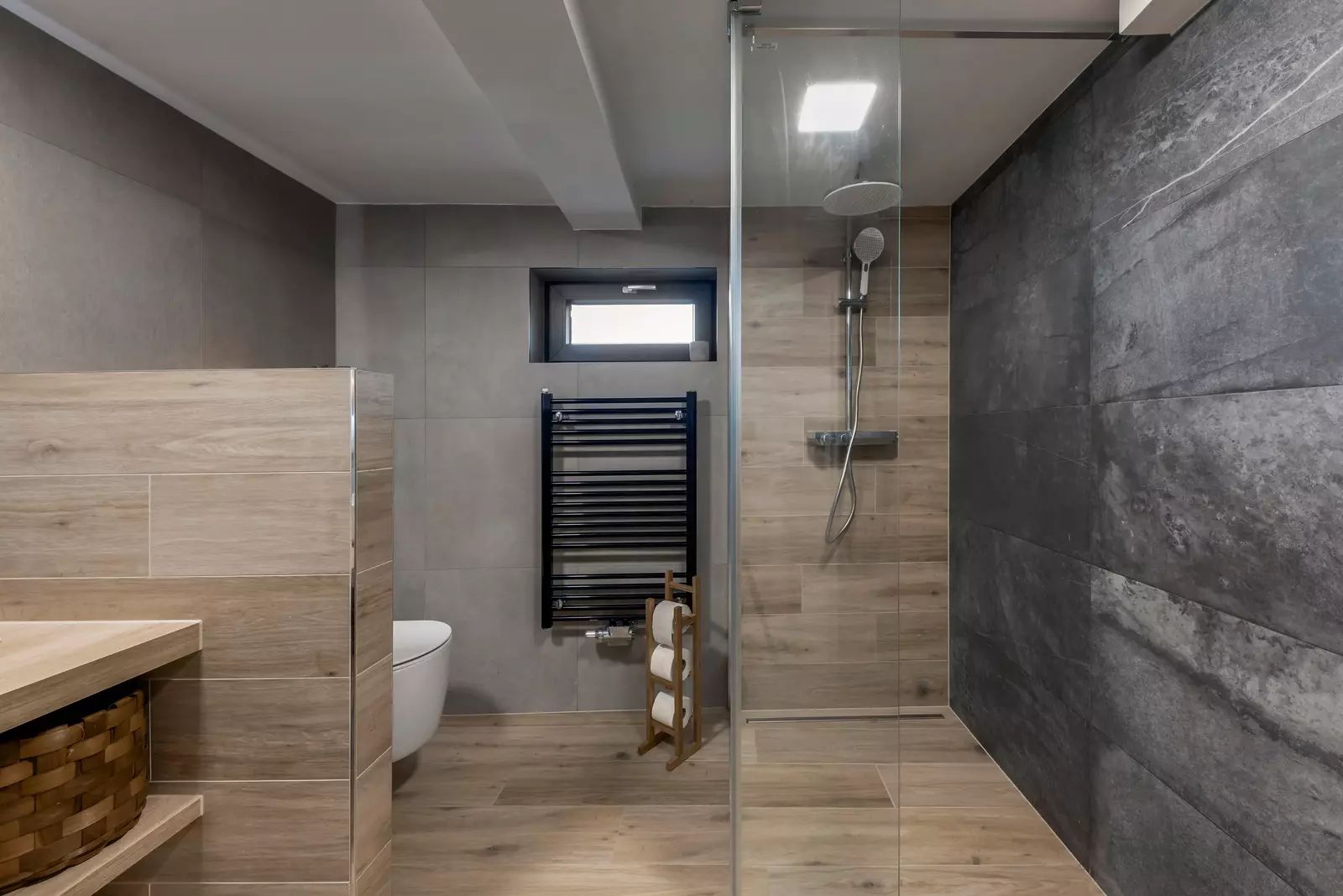 Interiér je dokonalým propojením dřeva, doplněné o designovou dlažbu, luxusní spotřebiče a hlavně je zde na každém kroku cítit otisk vkusného a praktického využití každého koutu.