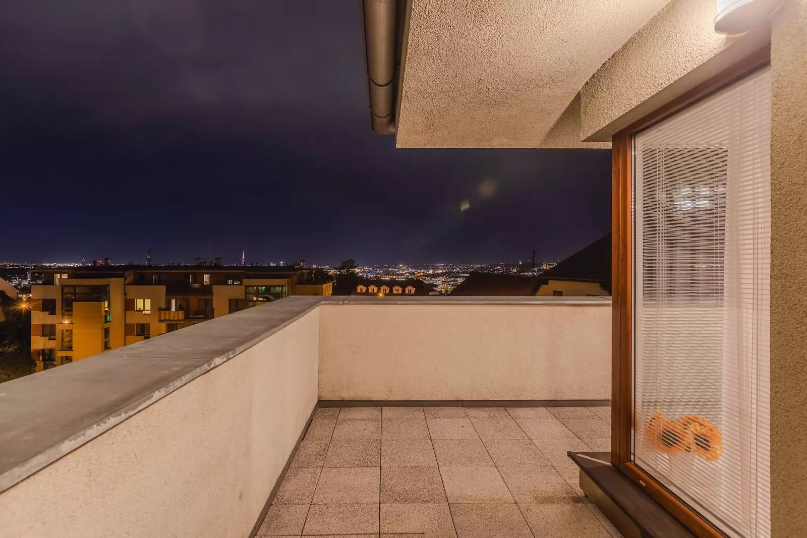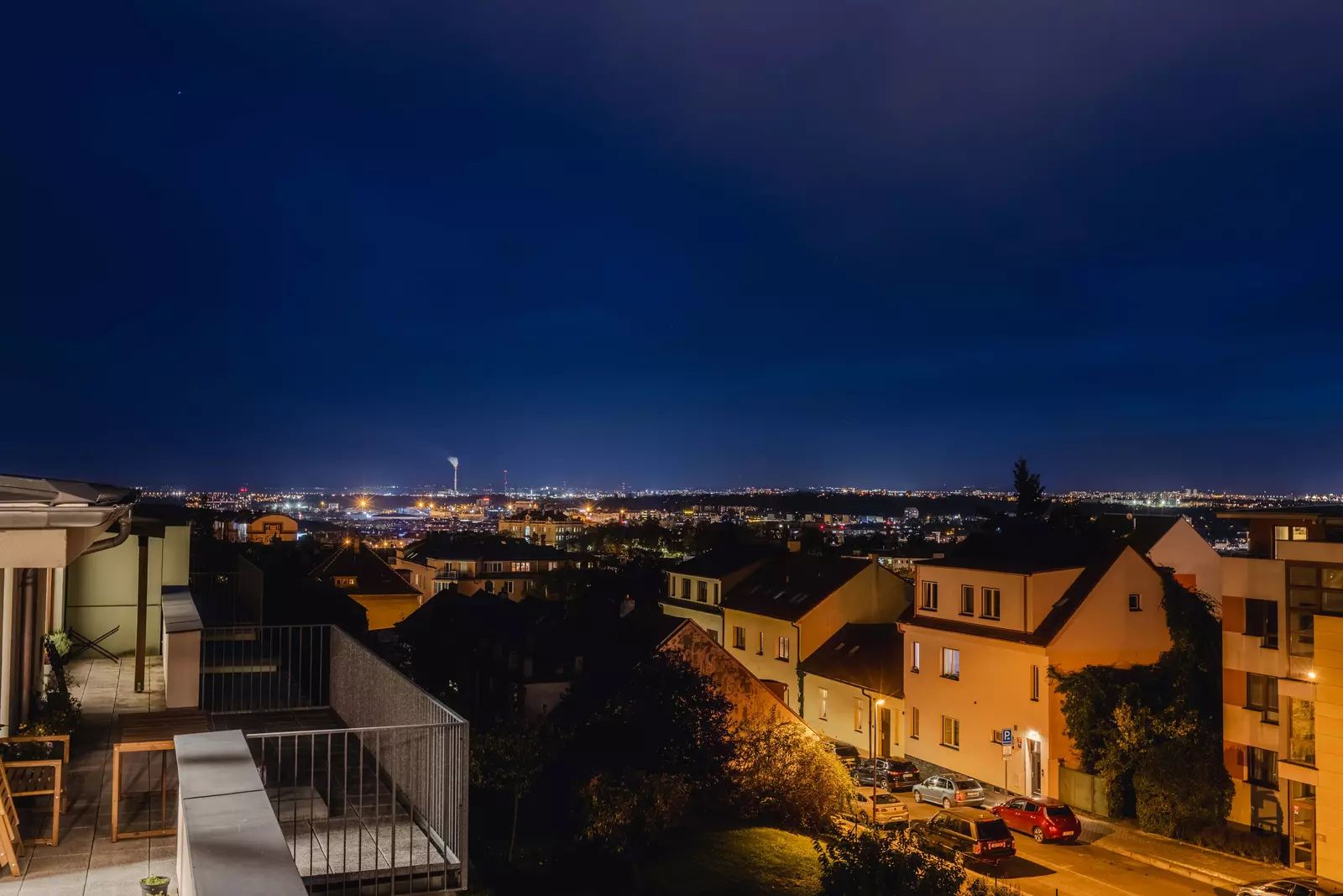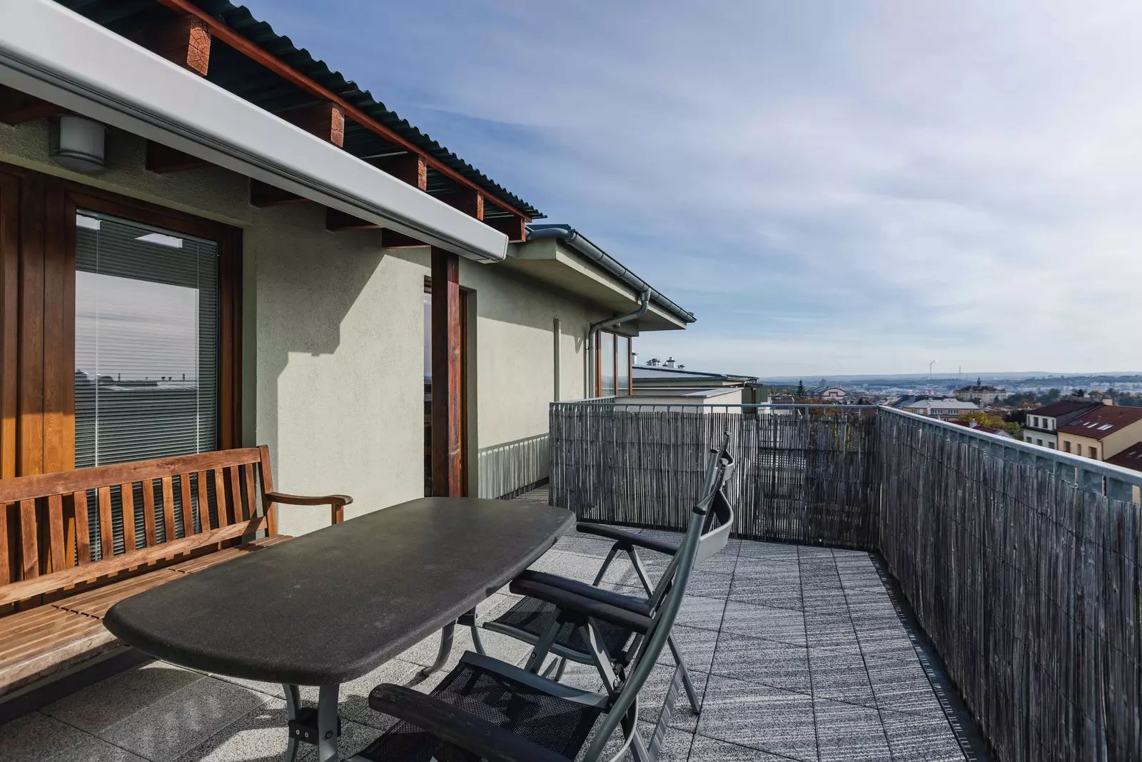 Terasa obklopuje celý byt a poskytuje panoramatický výhled na Prahu – ideální místo pro relaxaci, posezení s přáteli nebo klidné večery s výhledem na město.