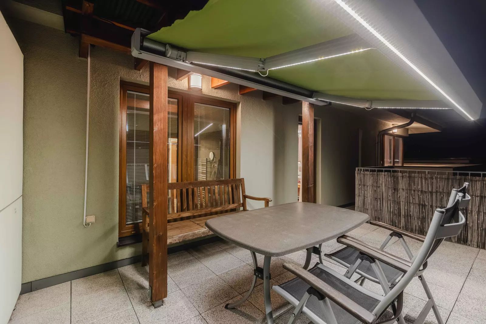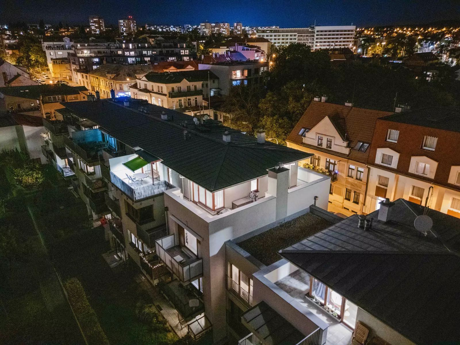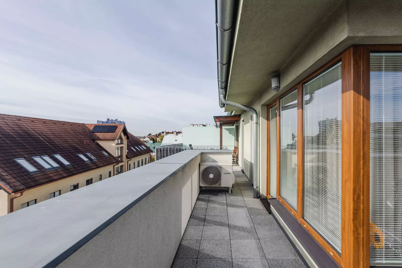Terasa obklopuje celý byt a poskytuje panoramatický výhled na Prahu – ideální místo pro relaxaci, posezení s přáteli nebo klidné večery s výhledem na město.