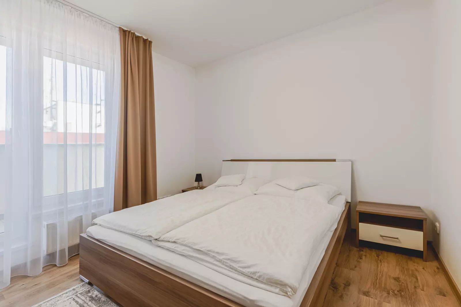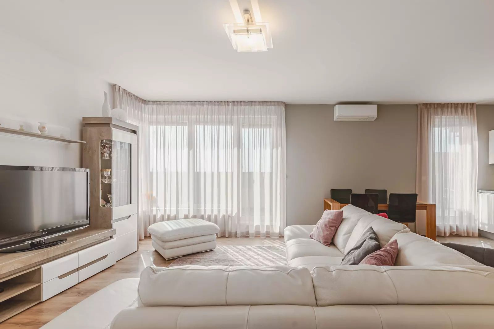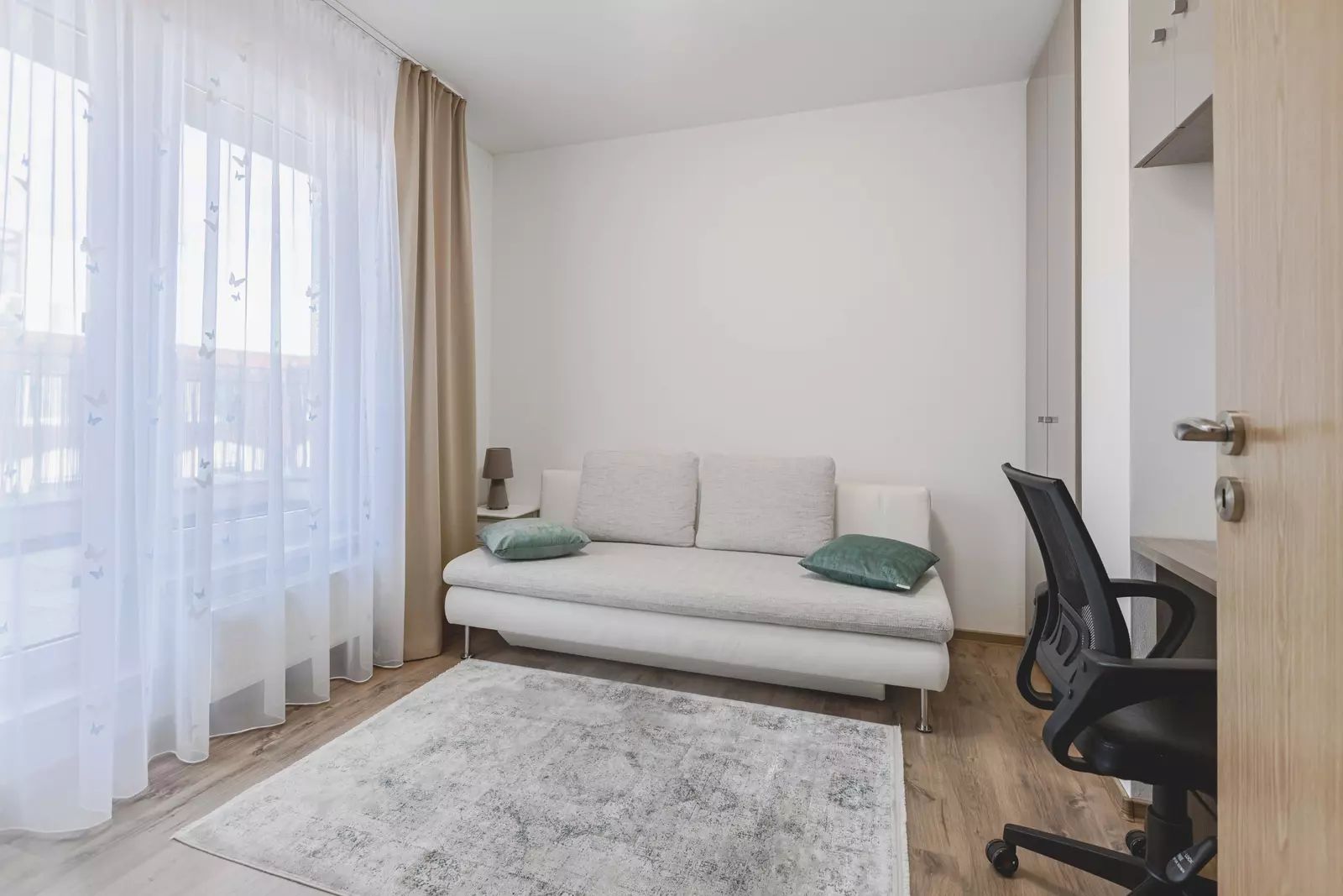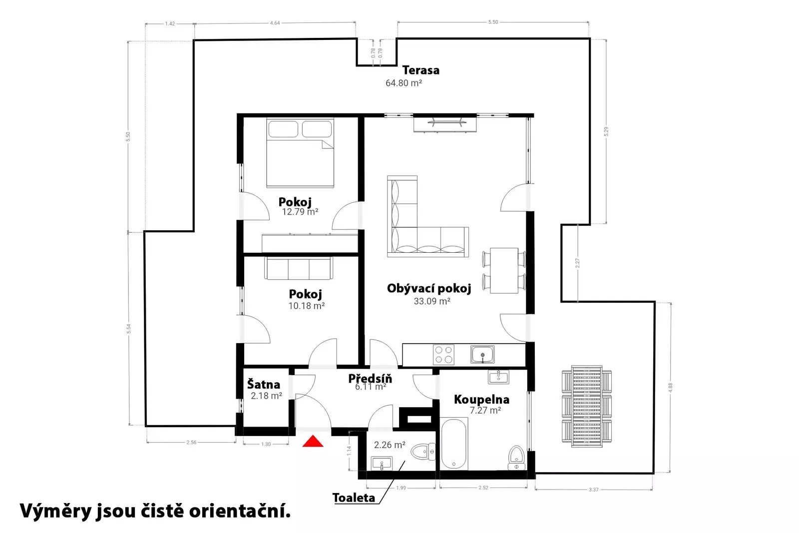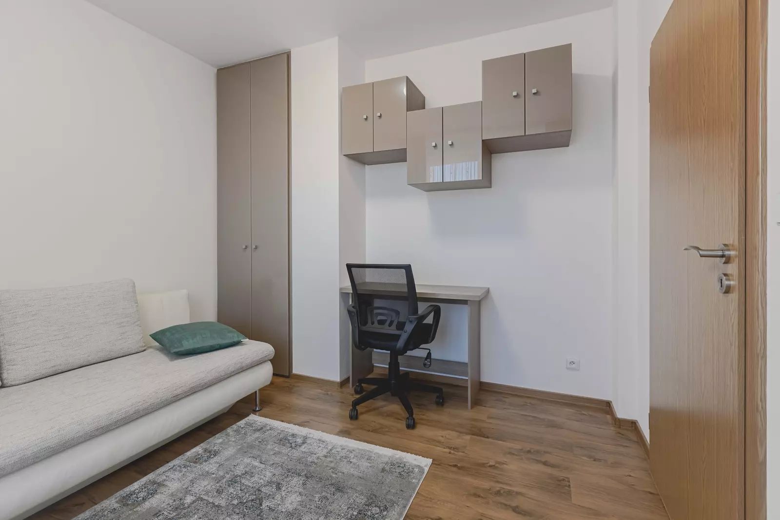 Dominantou tohoto bytu je prostorný obývací pokoj s kuchyňským koutem o rozloze 33 m², který je vybaven klimatizací a nabízí přímý vstup na rozlehlou terasu o velikosti 60 m².