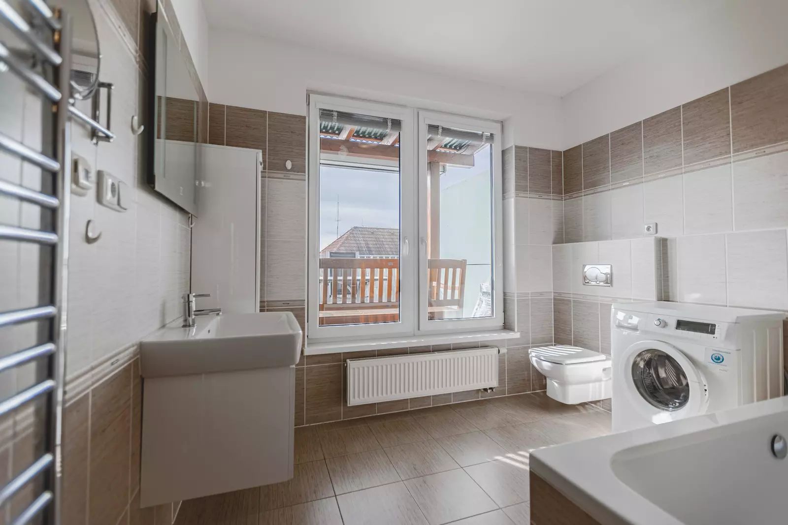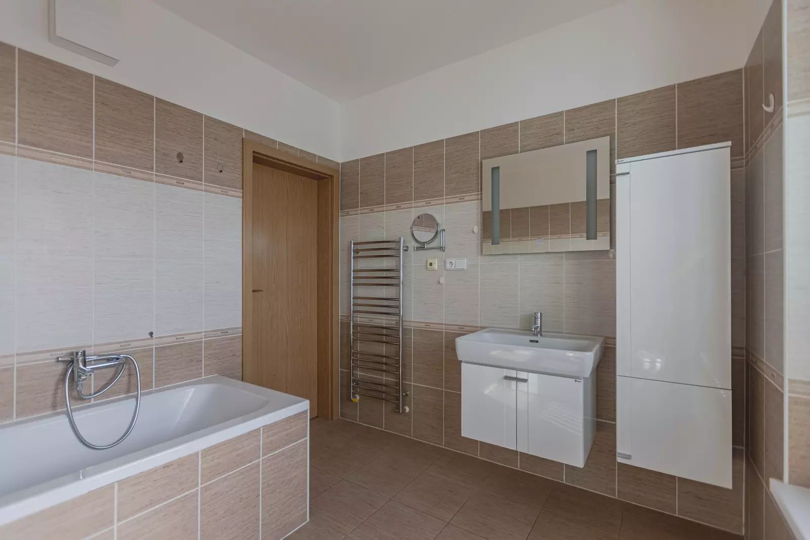 Koupelna je vybavena vanou, toaletou a oknem na terasu, k dispozici je i samostatná druhá toaleta a dvě komory – jedna přímo v bytě, druhá v mezipatře domu.