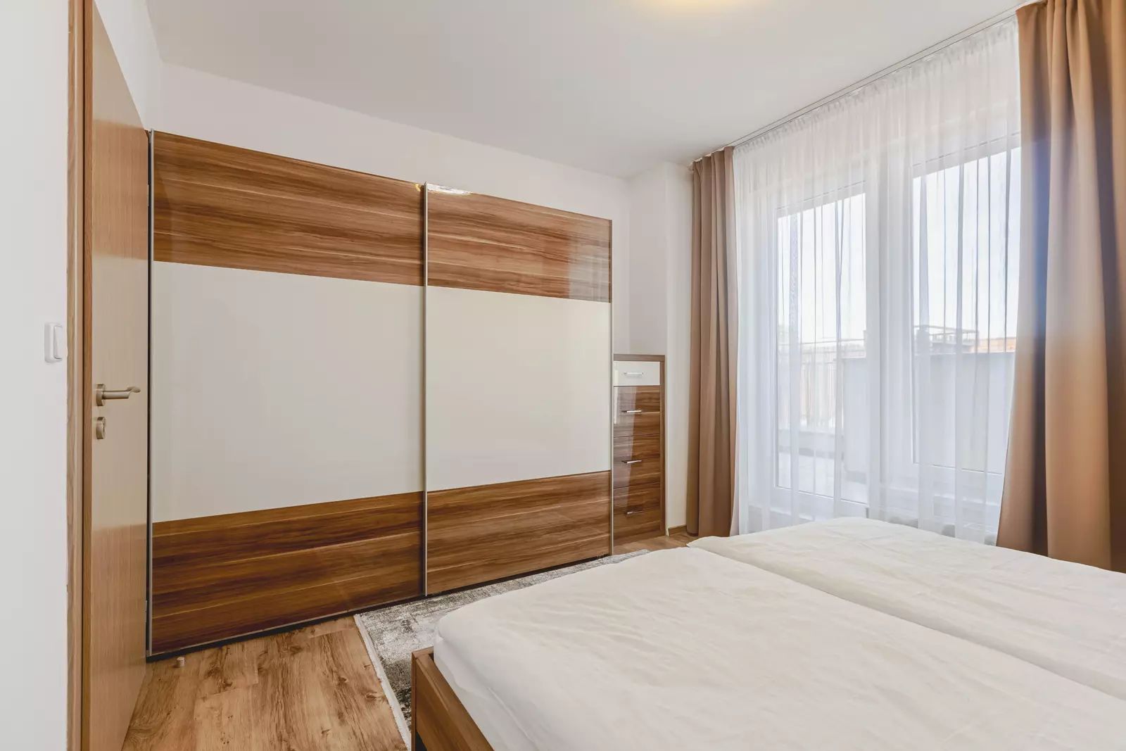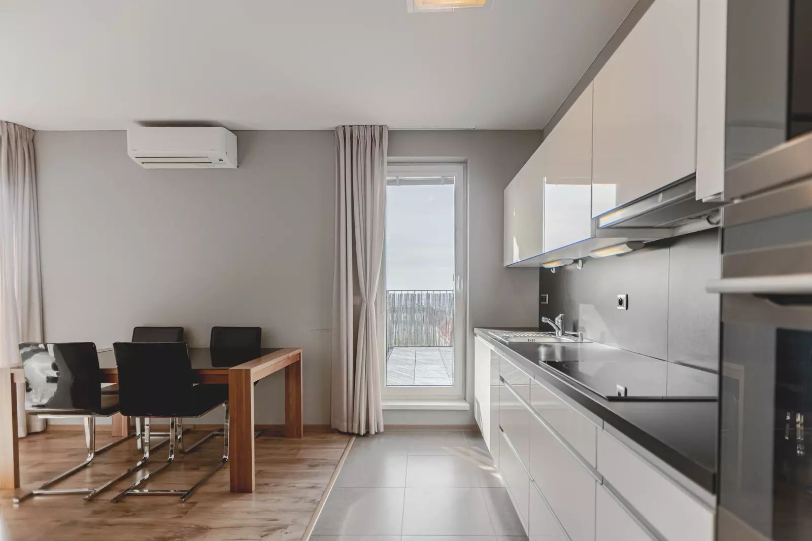 Dominantou tohoto bytu je prostorný obývací pokoj s kuchyňským koutem o rozloze 33 m², který je vybaven klimatizací a nabízí přímý vstup na rozlehlou terasu o velikosti 60 m².